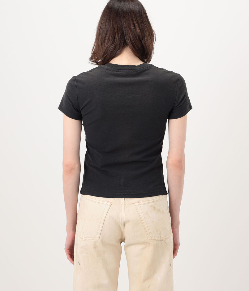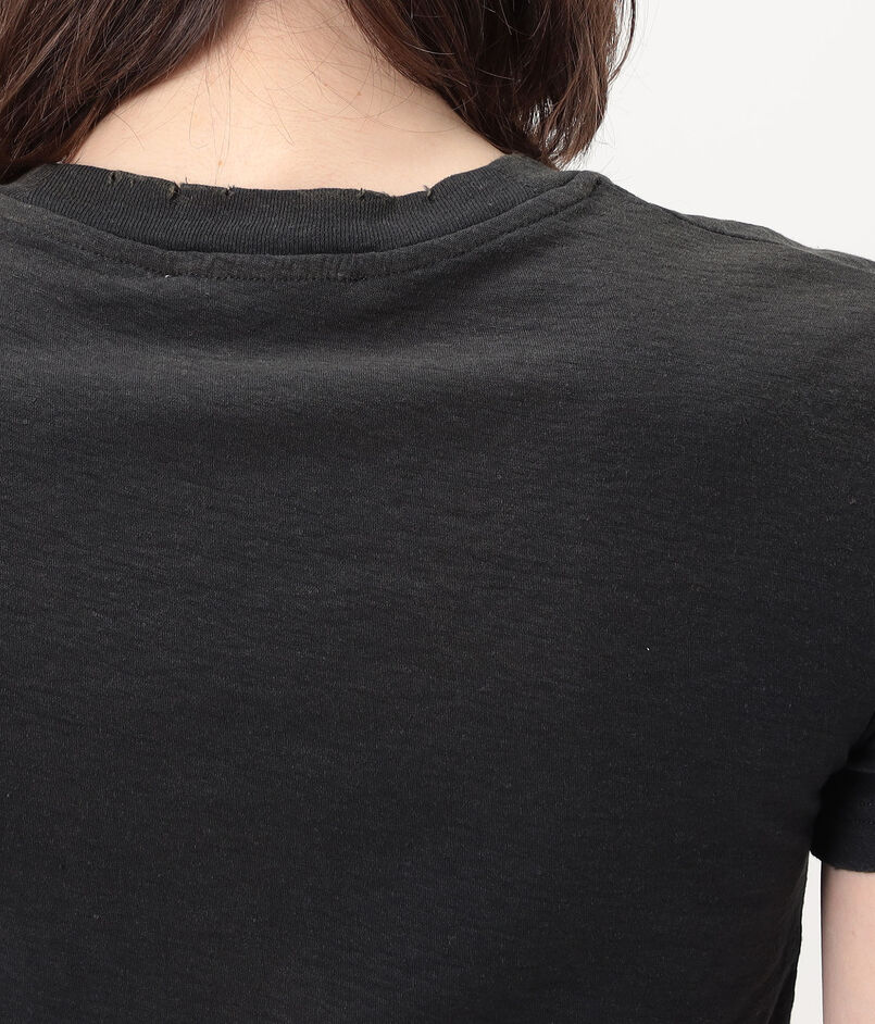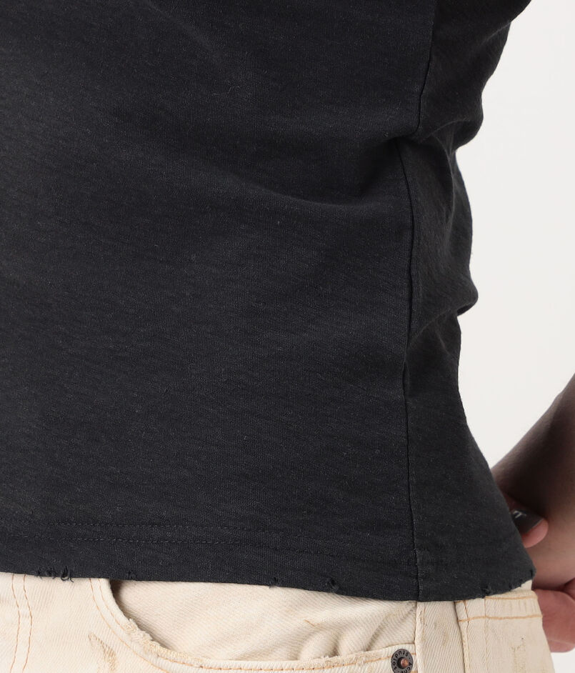 ネックラインや袖口に施されたダメージ加工が、時を経たヴィンテージさながらのムードを演出します。
