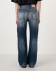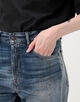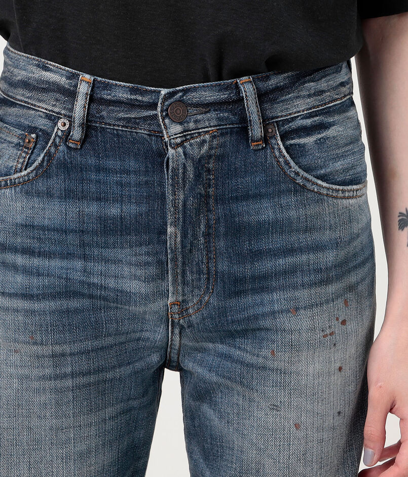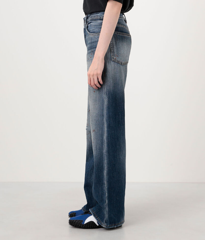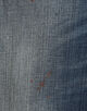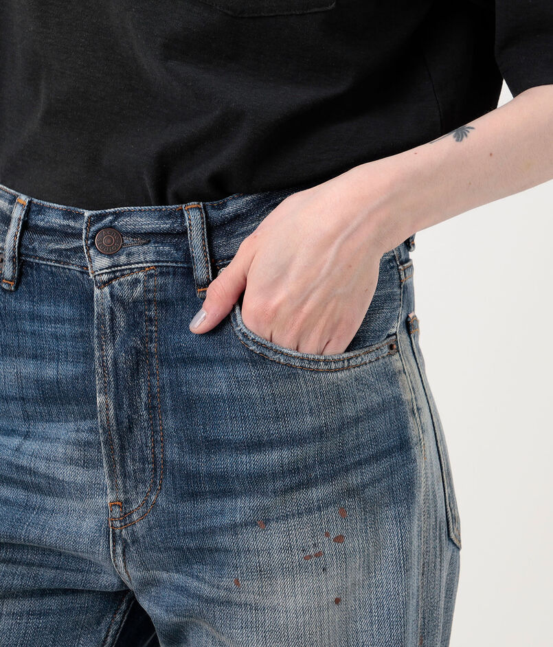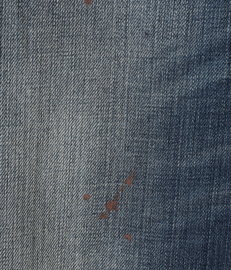 ヴィンテージライクなブルーウォッシュ加工に、手作業でペイント、ダメージ、ステイン加工を施し、履き込んできたような風合いを表現。