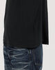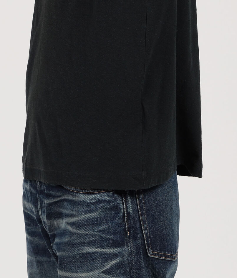 ネックラインや袖口に施されたダメージ加工とスプレーによるフィニッシュが、時を経たヴィンテージさながらのムードを演出します。