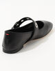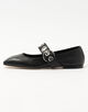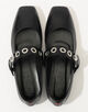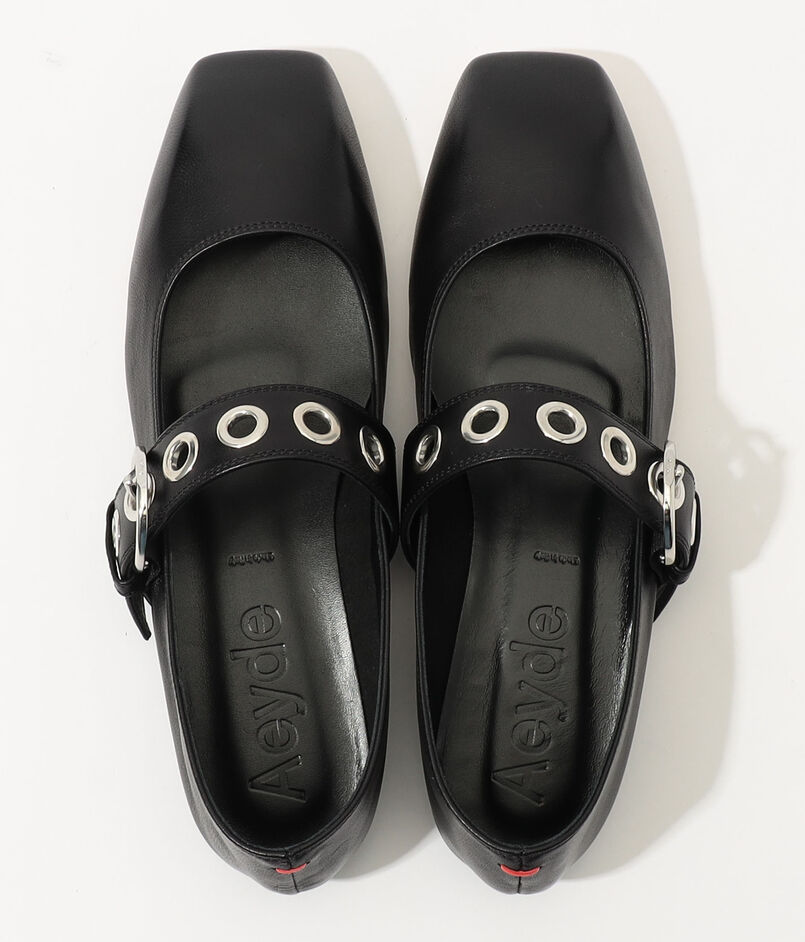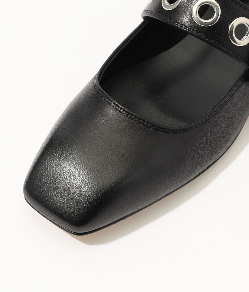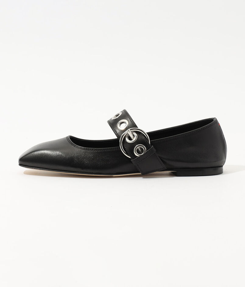 ストラップにメタルのアイレットが特徴的なフラットシューズ。