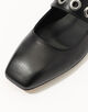 スクエアトゥがすっきりとした印象ながら、シンプルな装いにアクセントをプラスするデザイン。