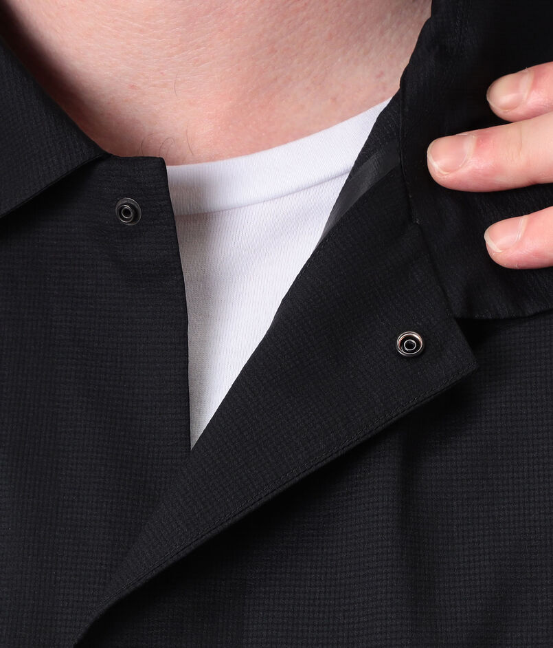 シームテープの縫い目や、フロントの隠しスナップボタンなど、こだわりのミニマルなディテールが実用性と美しさを両立させる一着。