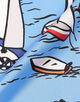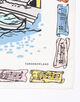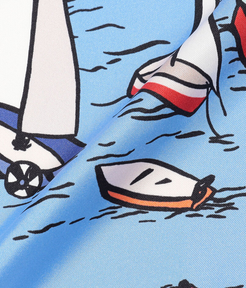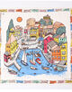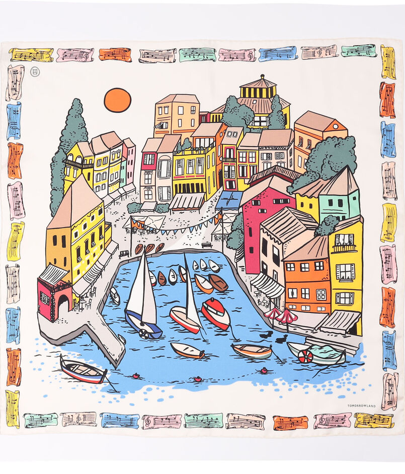 入り江を囲む活気ある街並みを、カラフルでにぎやかなタッチで表現したスカーフ。