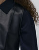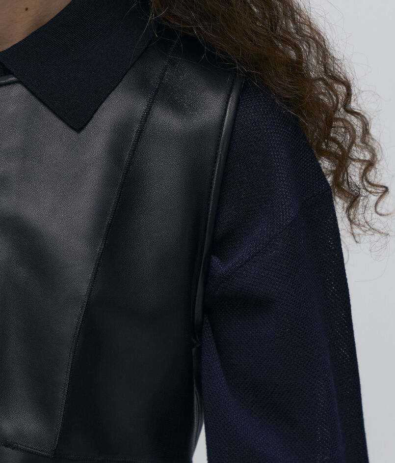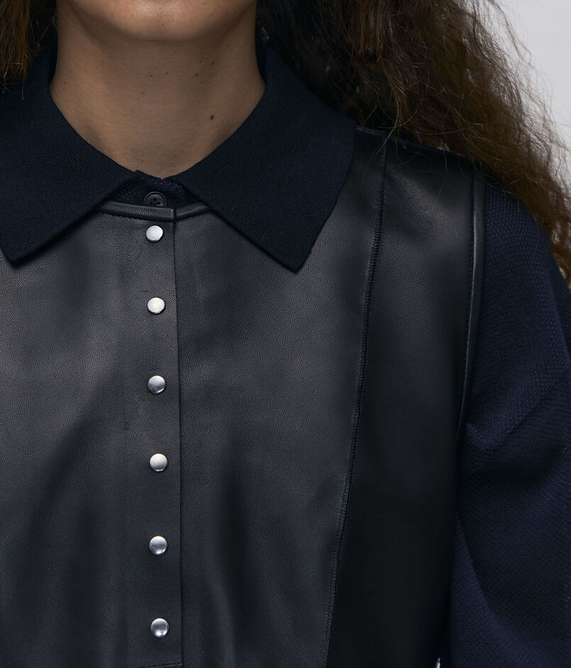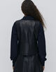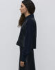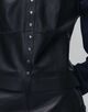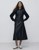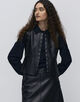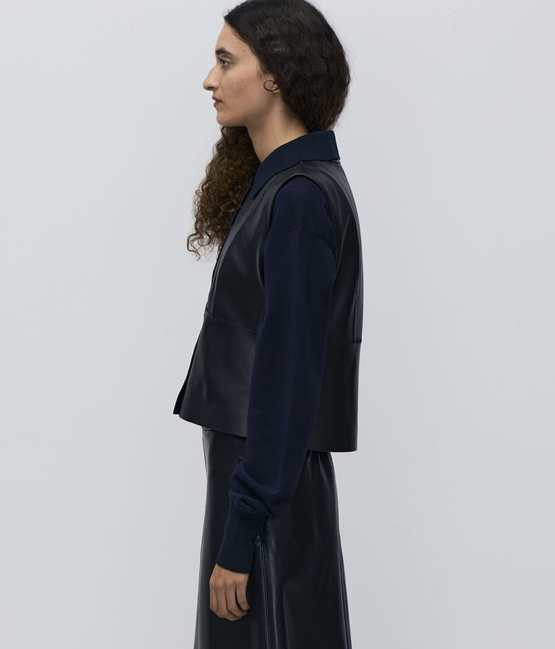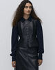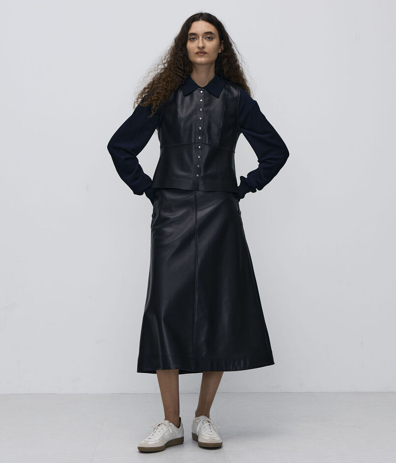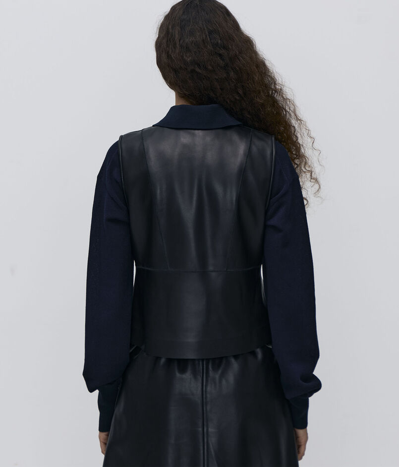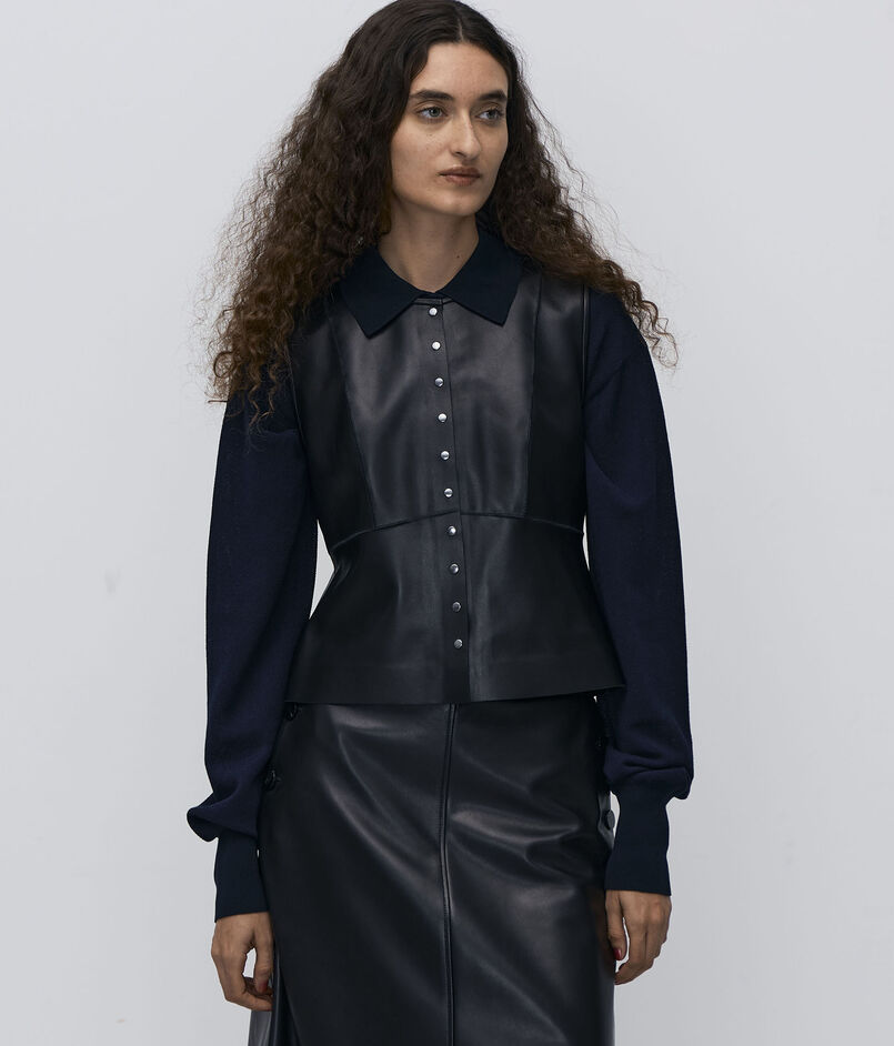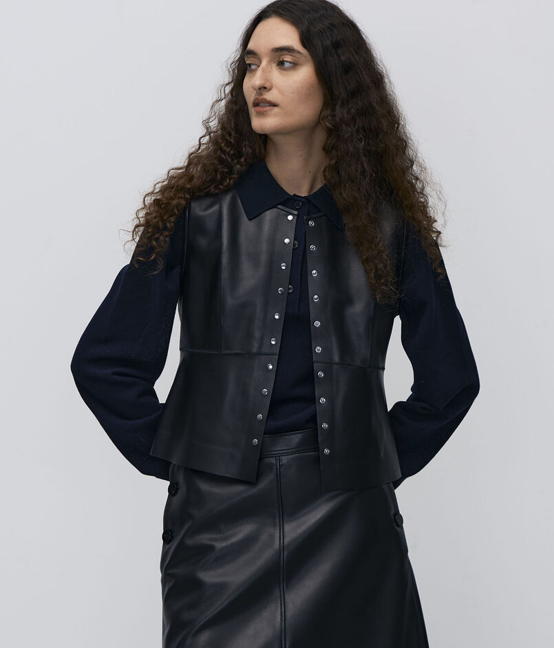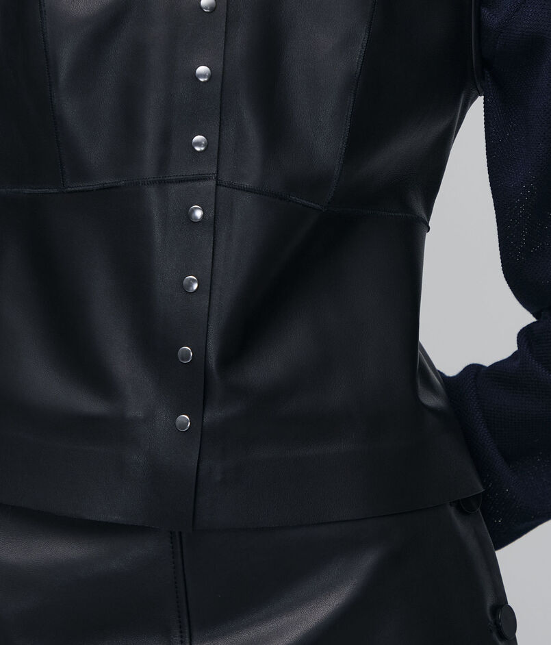 高めの切り替え位置から裾に向かって広がるペプラムシルエットにフロントに連ねたスナップボタンでモードな着こなしが決まるジレ。