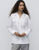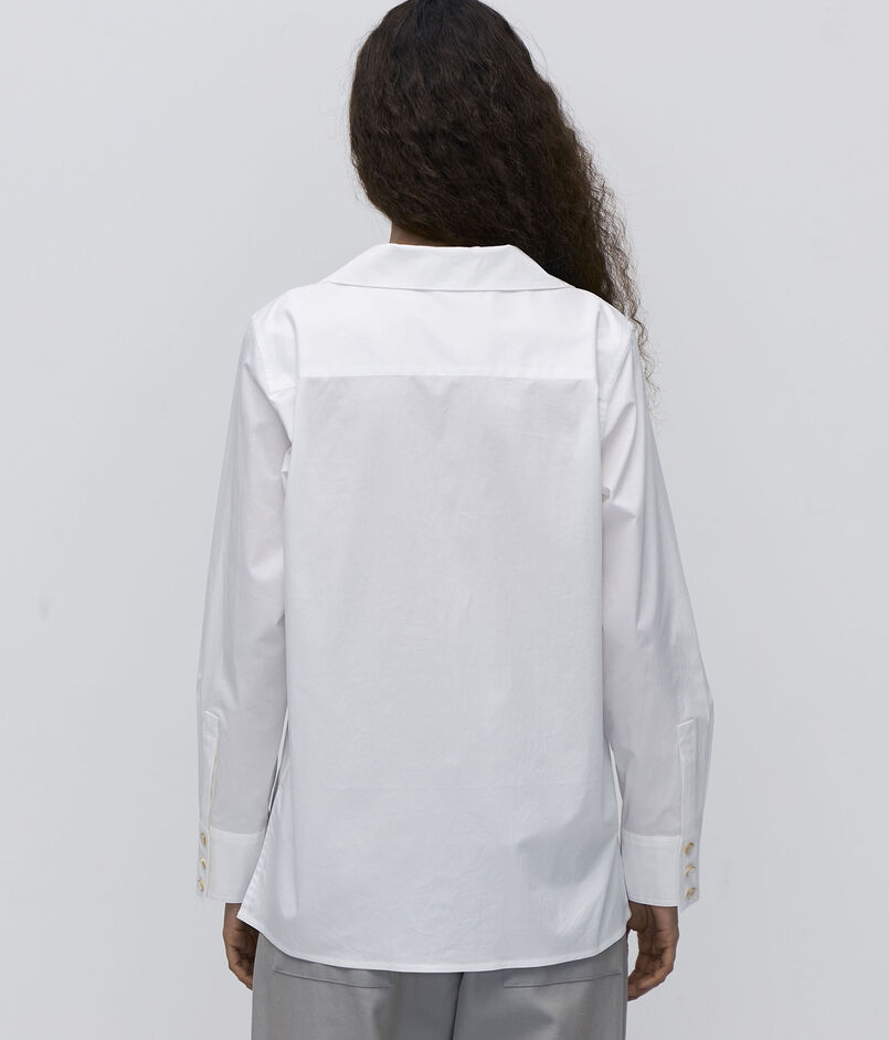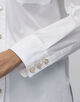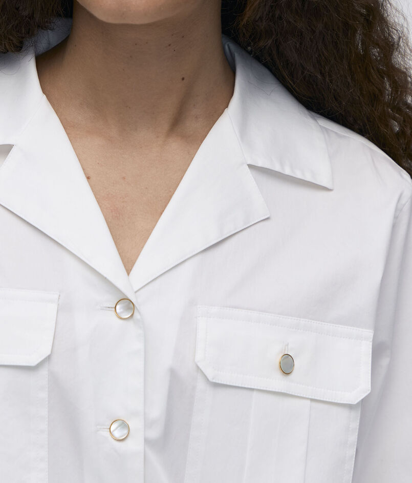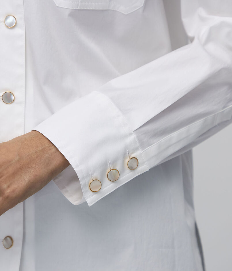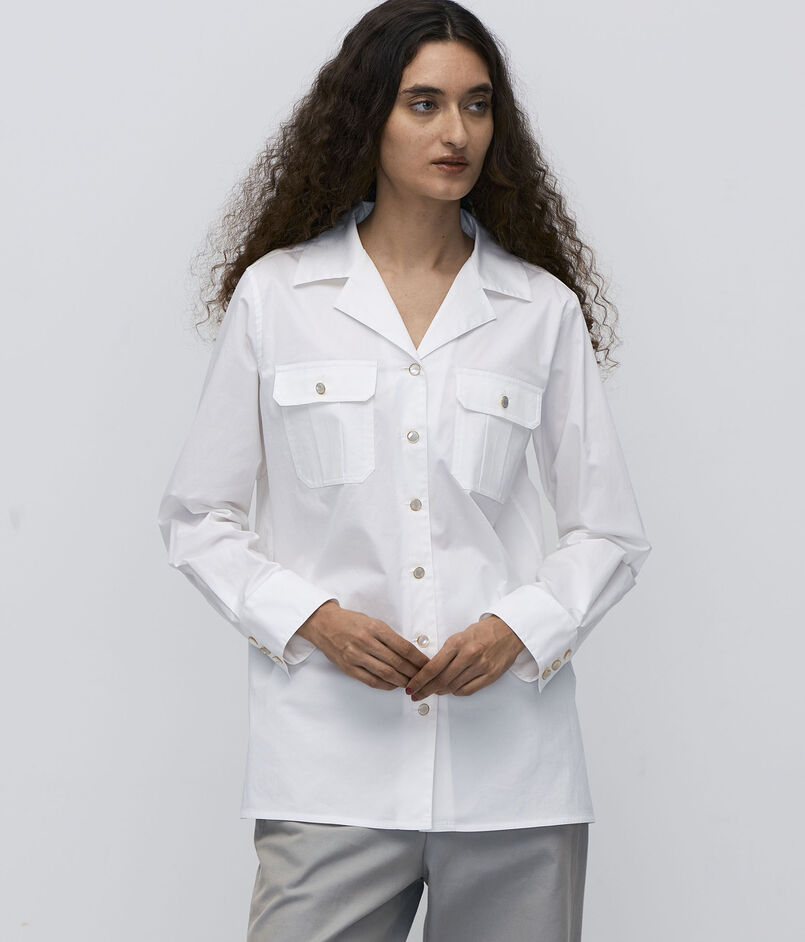 70年代スタイルのビンテージから形をとり、ゴールドボタンのホワイトシャツをカジュアルに着用できるよう仕立てています。