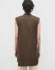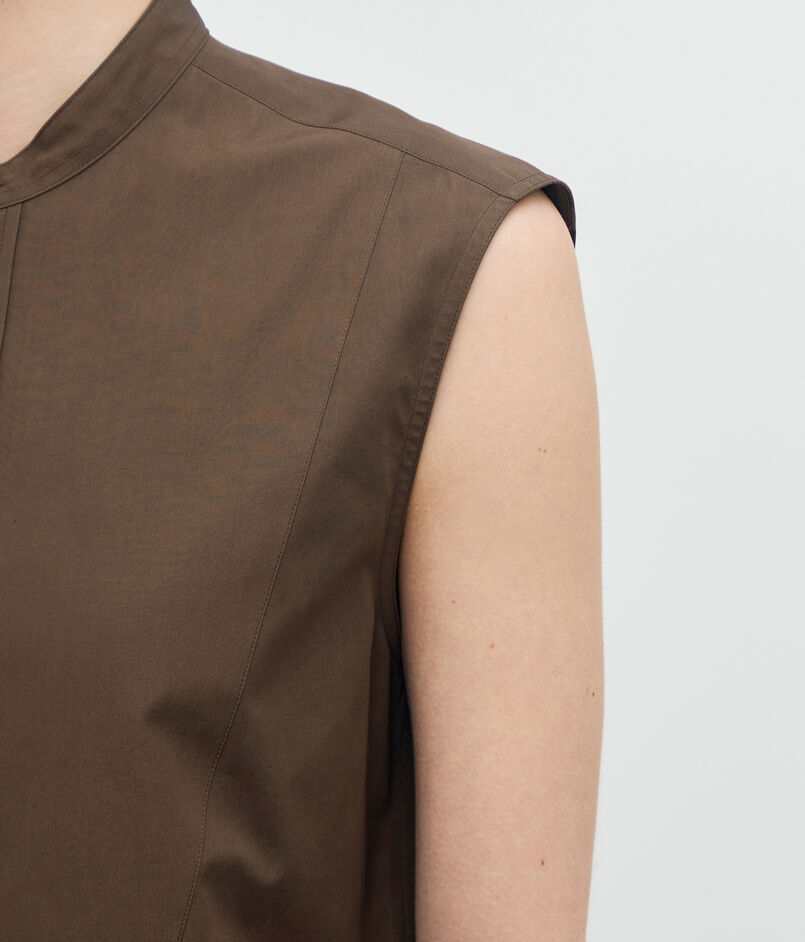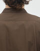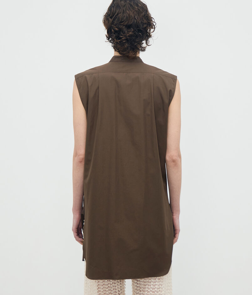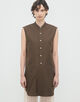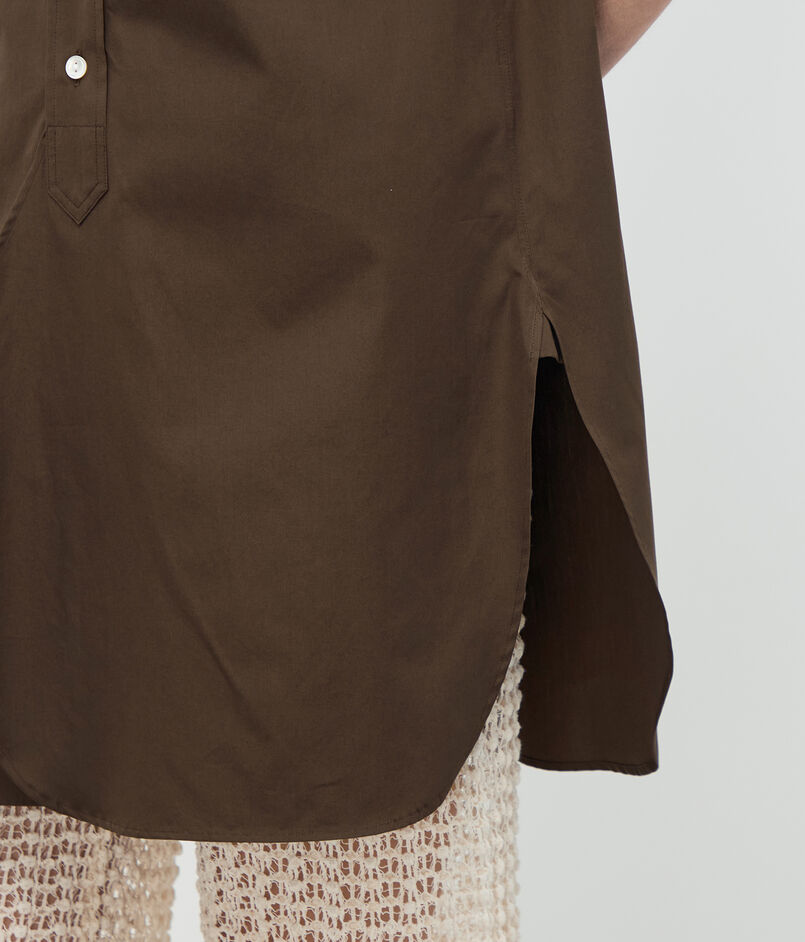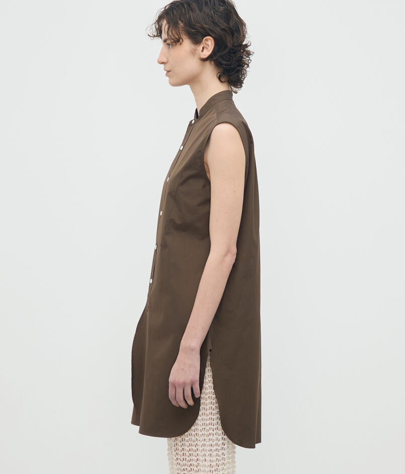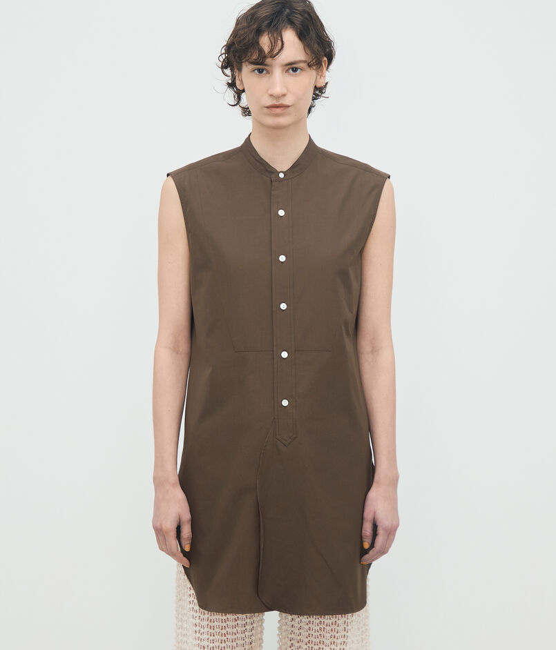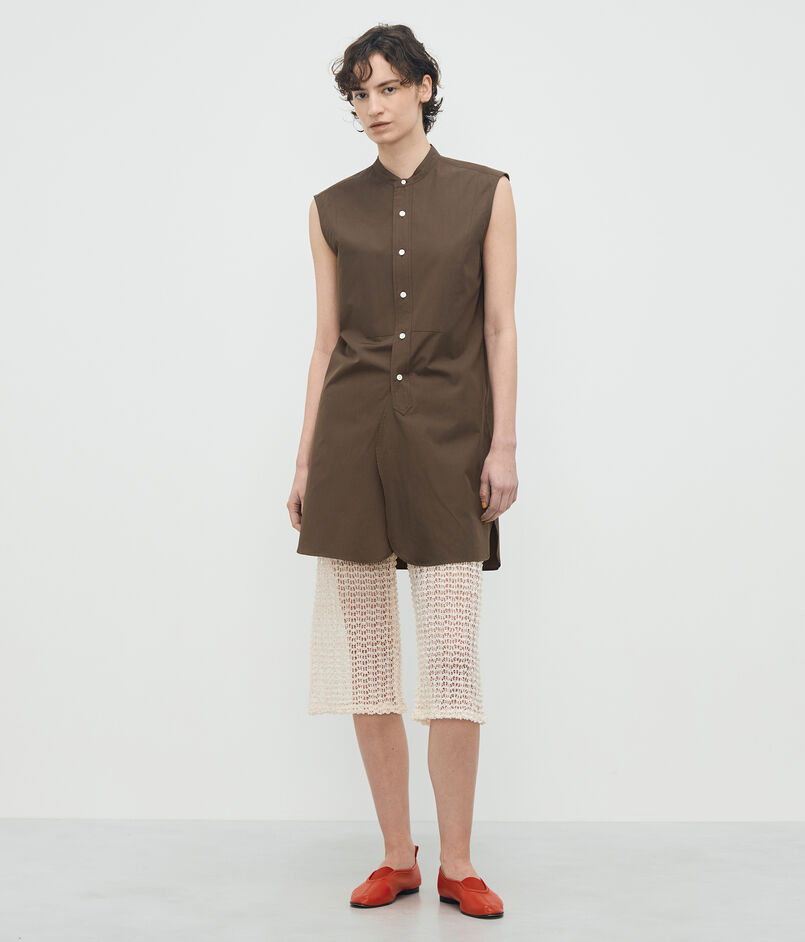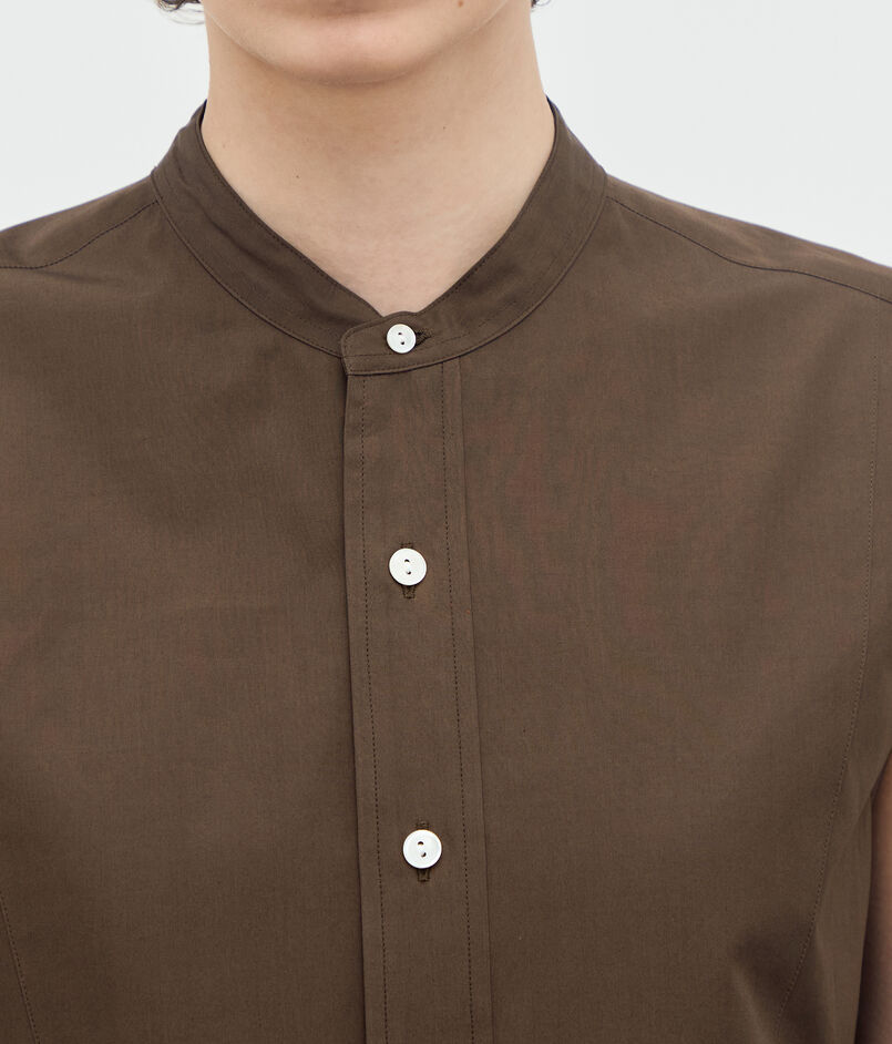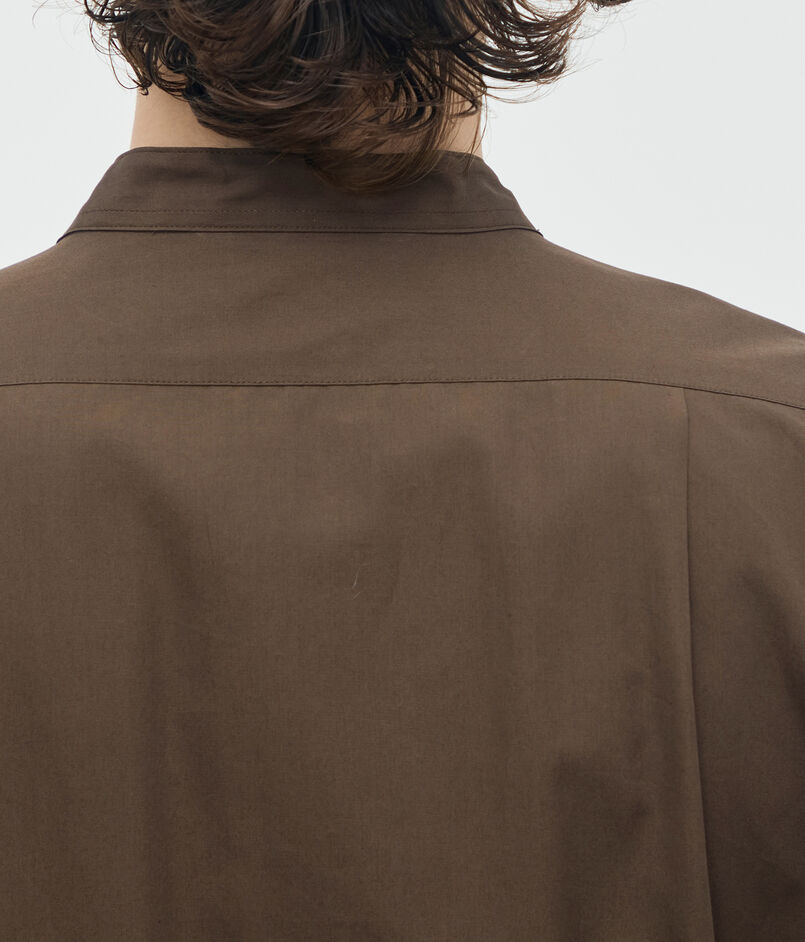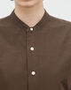 顔まわりをすっきりと見せるバンドカラーと、長めの着丈がデザインポイントのシャツ。