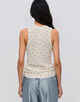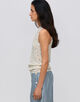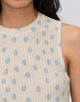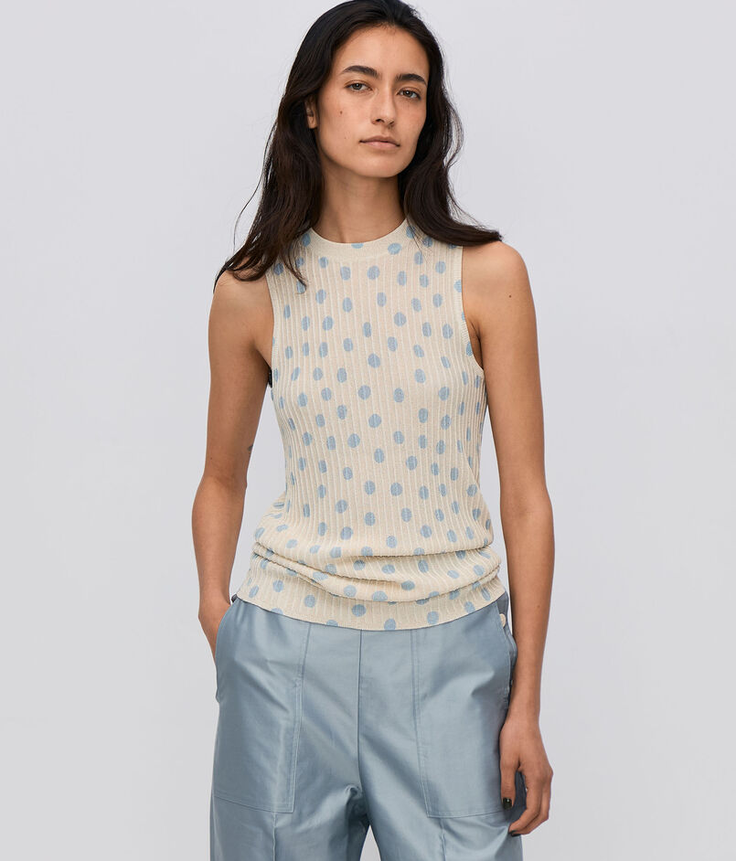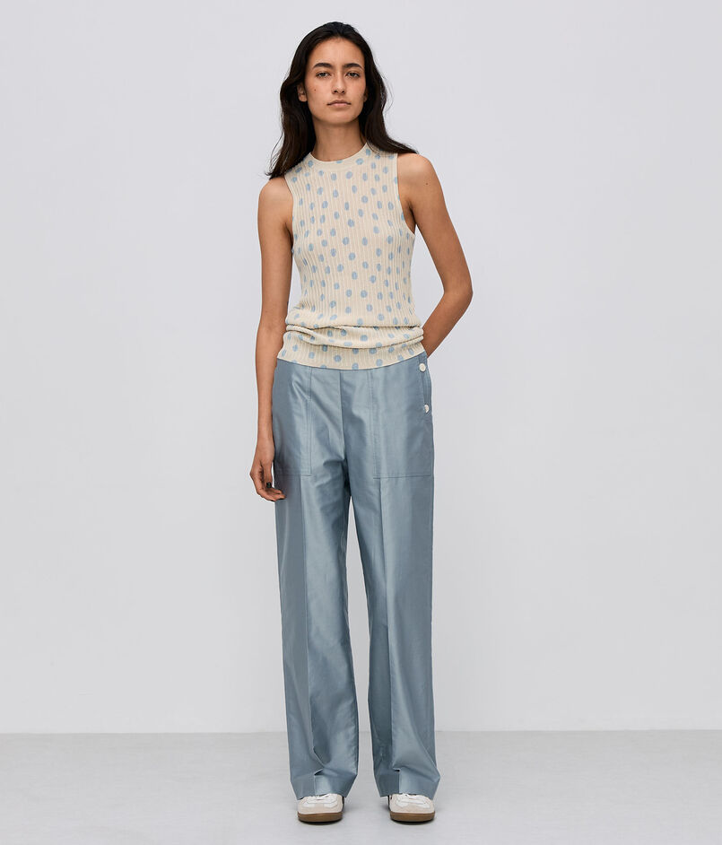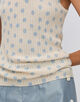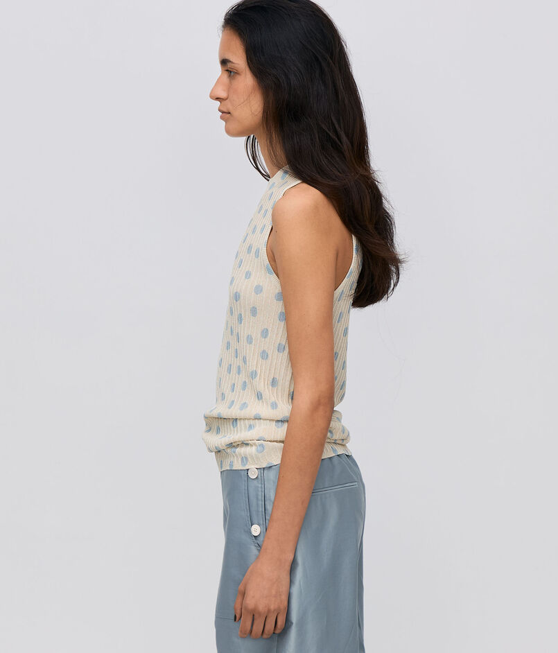 襟ぐりの詰まったソフトアメリカンスリーブ。ベストのように重ねて着用するのもおすすめ。