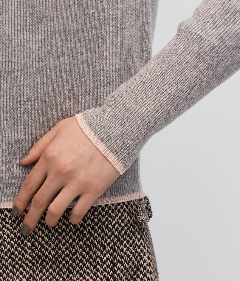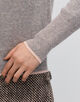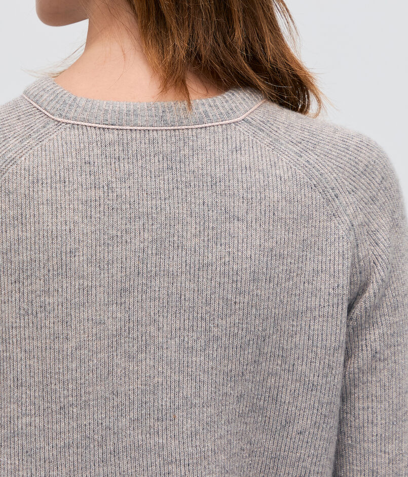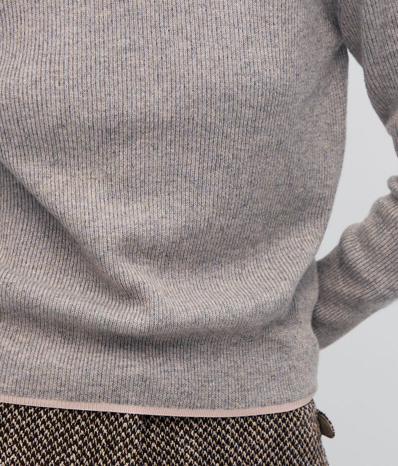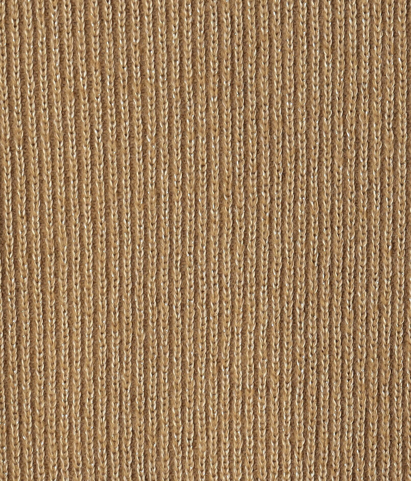 ラメ糸とウールを近い糸でなじませ、ウールの下で発光しているようなあたたかみのある表情に仕上げています。