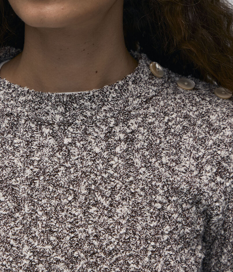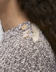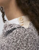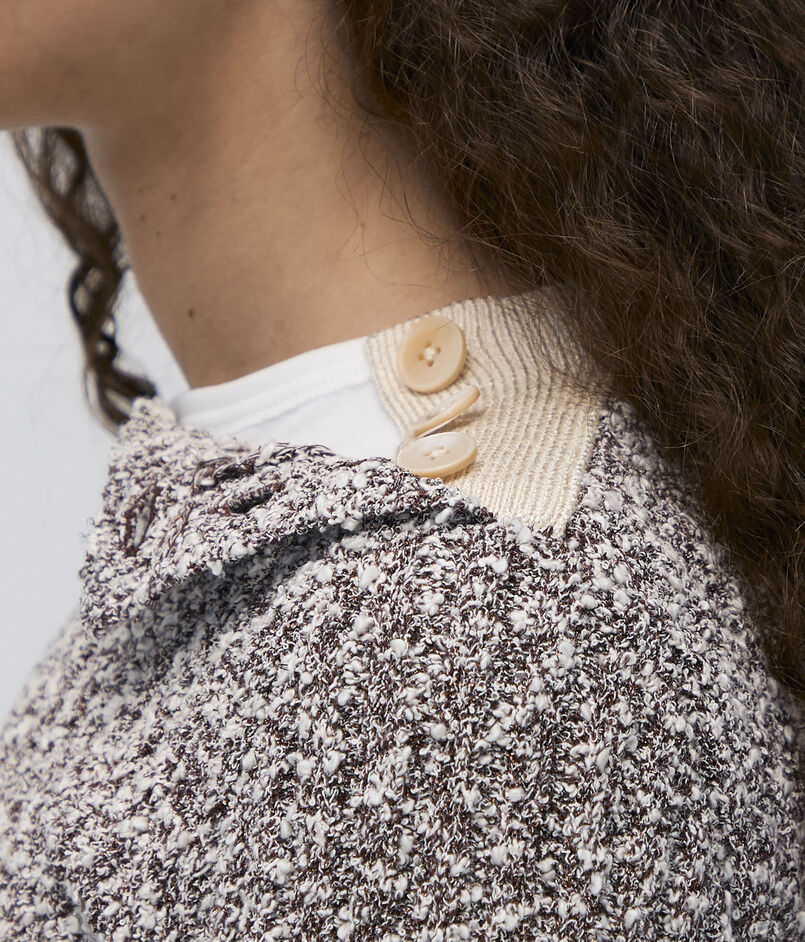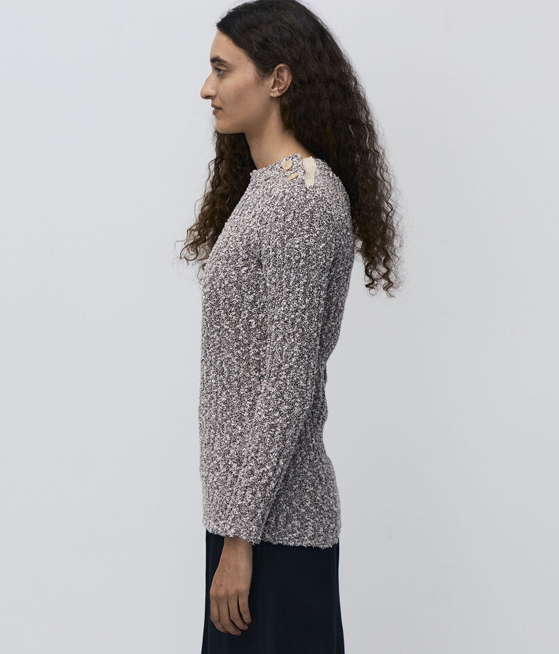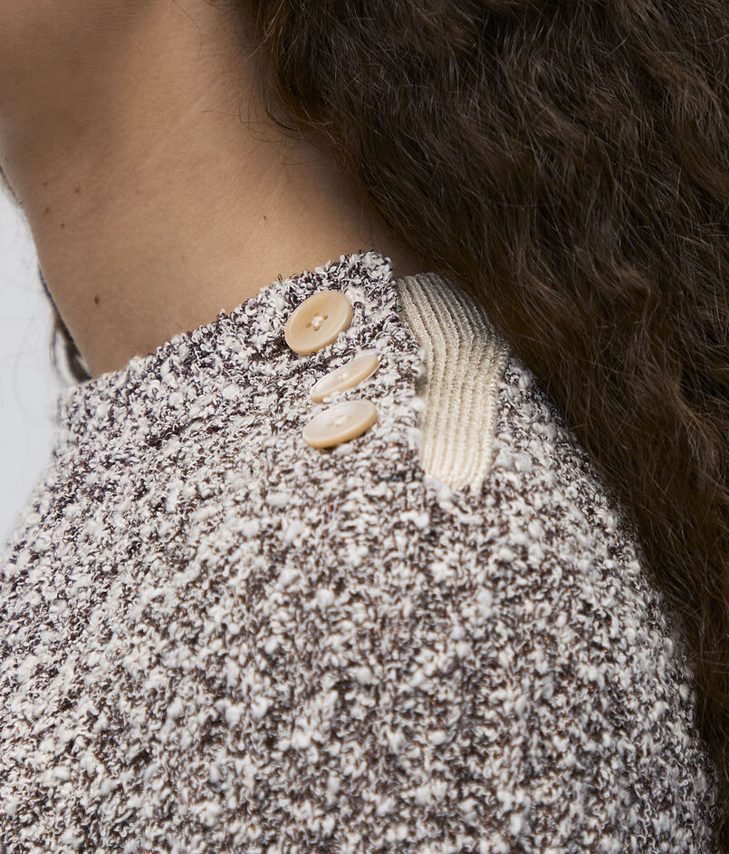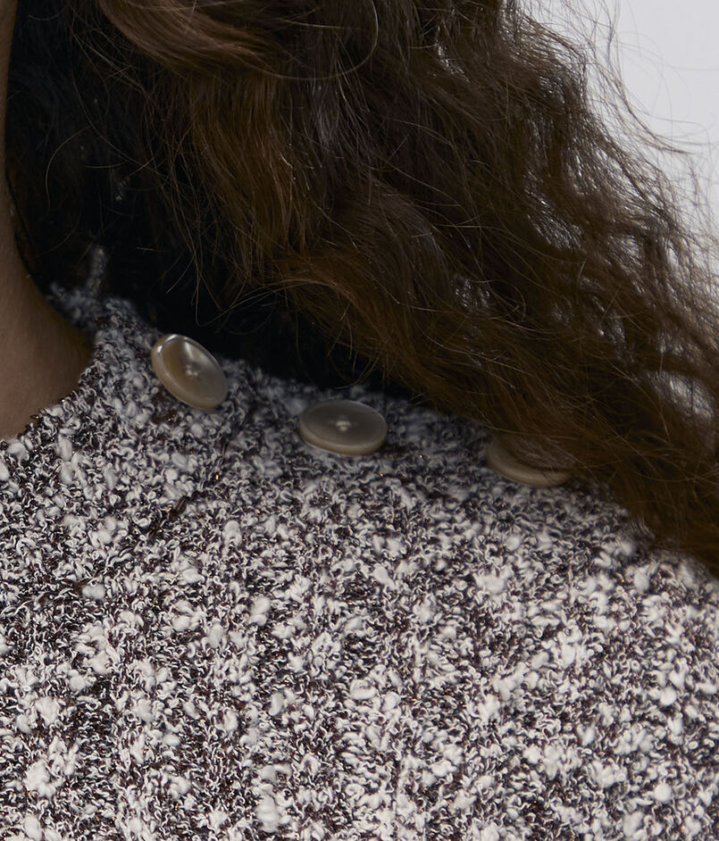 左肩に配したボタンは持ち出し部分を別糸、配色にしているので開けてポイントにしても着用いただけます。