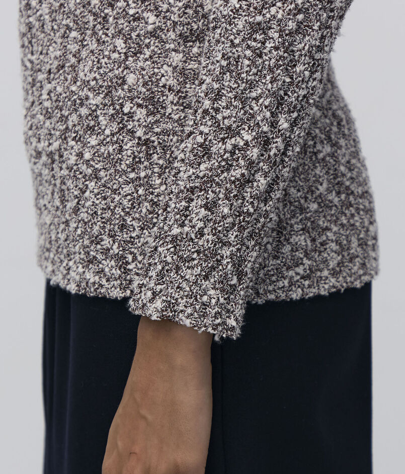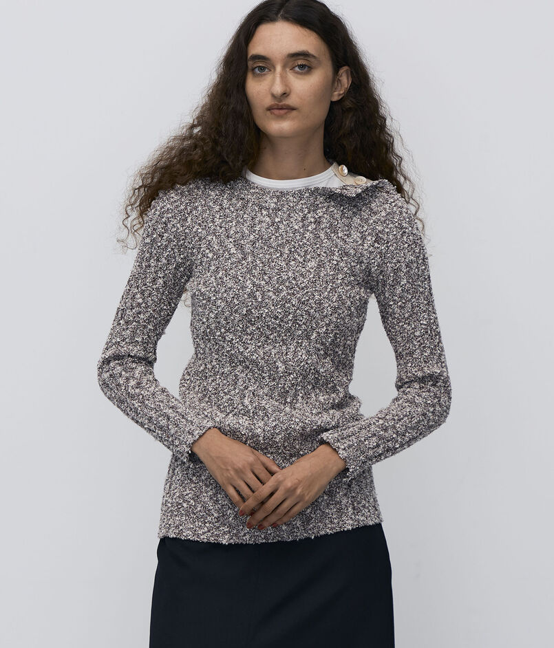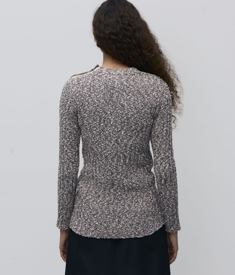 くるくるっとしたファンシーヤーンとラメをミックスしたイタリア糸で編み上げた、立体感のある表情が可愛らしいニットシリーズ。