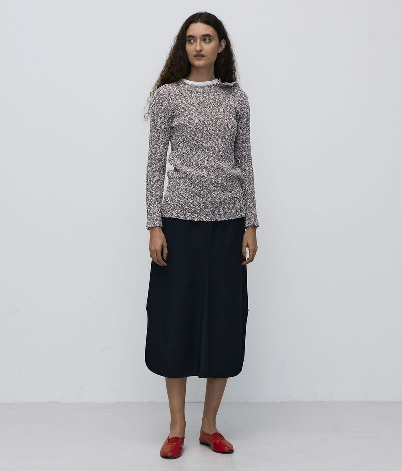 プルオーバーはコンパクトなネックラインでクリーンかつ女性らしい印象の一着。