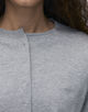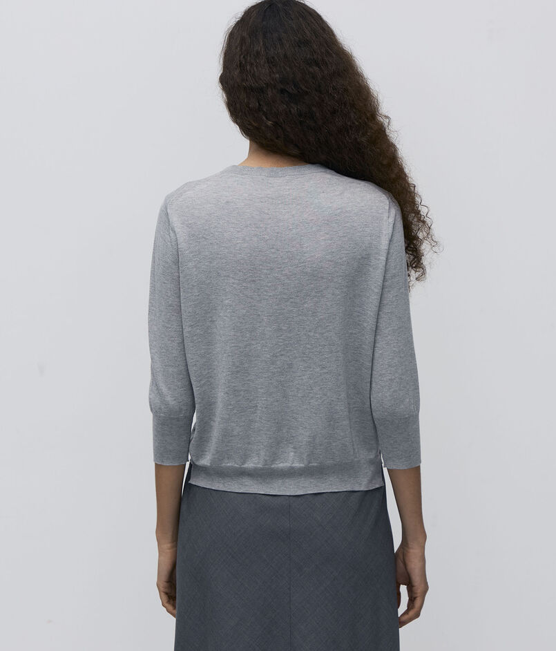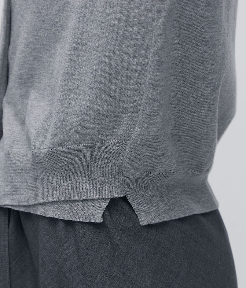 シンプルなクルーネックデザインながら、襟ぐりと裾のリブを上下に離し、さらに脇の位置をずらして付けることで、編み地のさりげない動きにアクセントを加えています。
