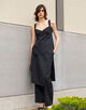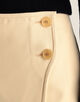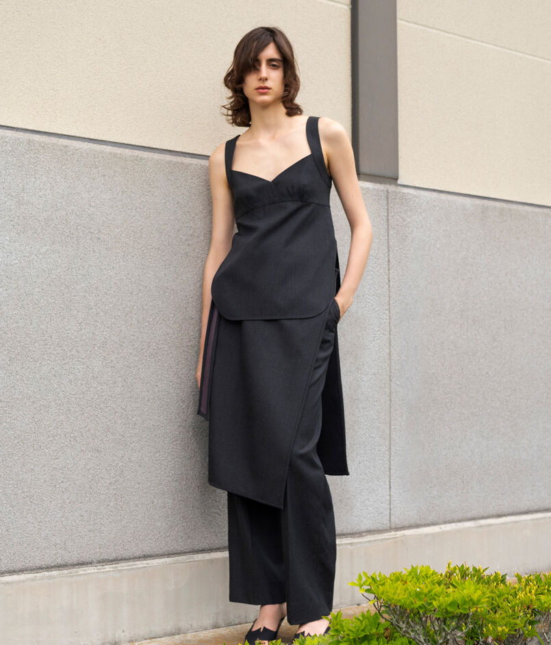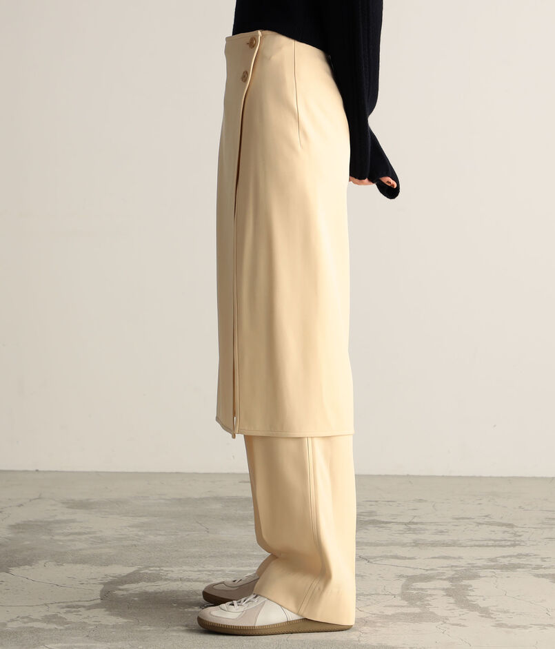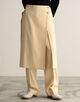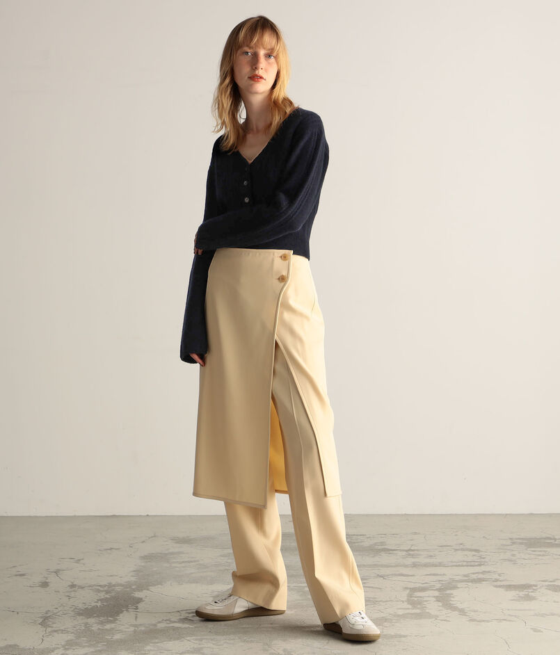 体に巻き付けボタンで留めるデザインで、すっきりとしたストレートシルエットと深めのスリットがポイント。