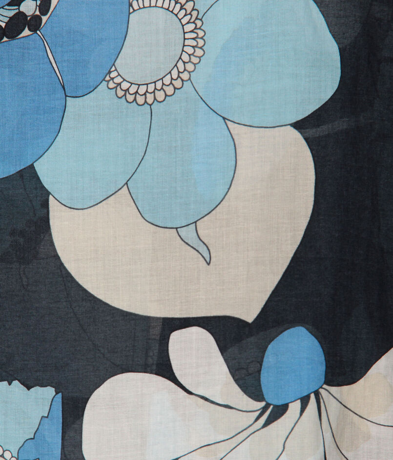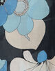 軽やかなブラックベースに、クラシカルなタッチで描かれた花柄を大胆なブルーの配色で表現し、華やかな印象に仕上げています。