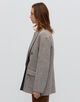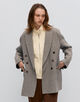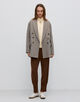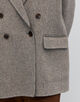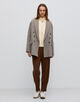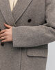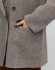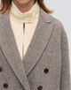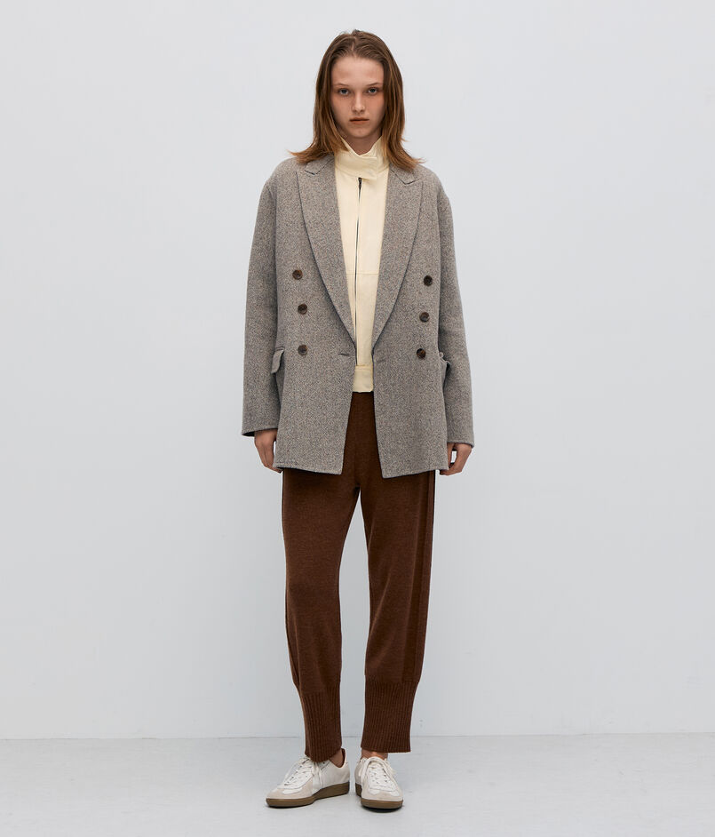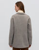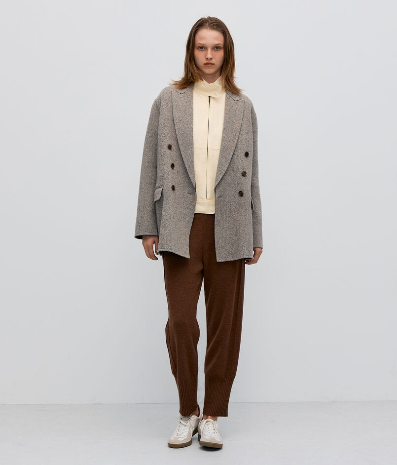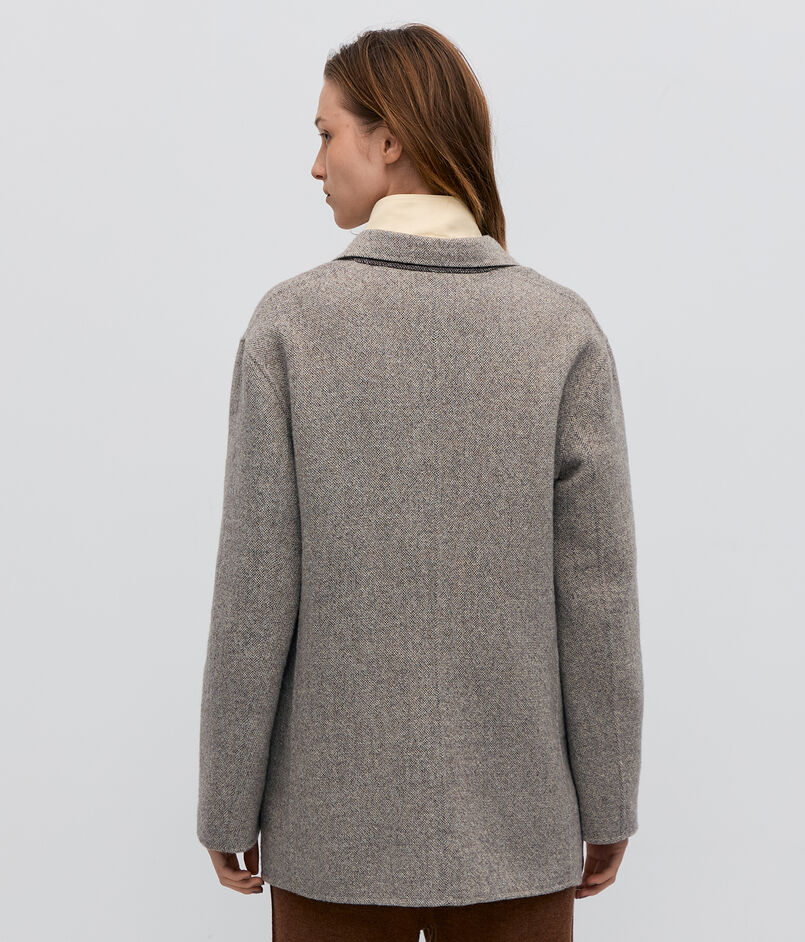 ジャケットコートはピークドの大きめの襟と長めの丈感で、ジャケットとコートの間のようなバランスでお召しいただけます。