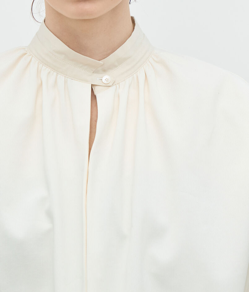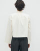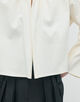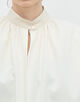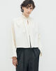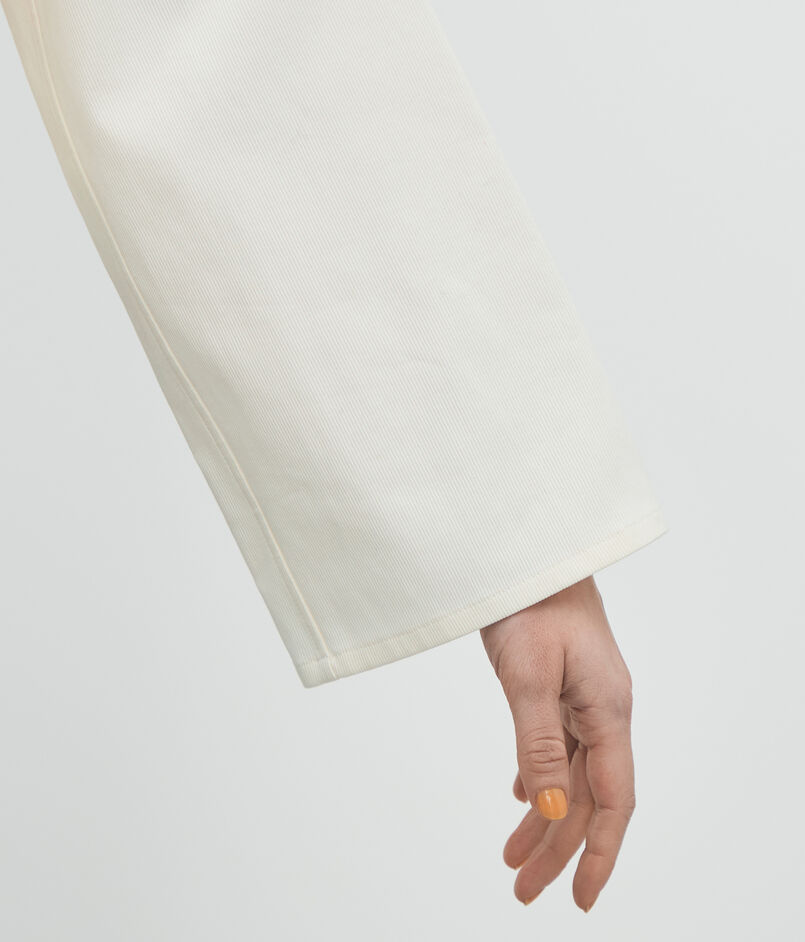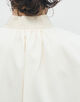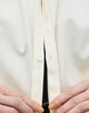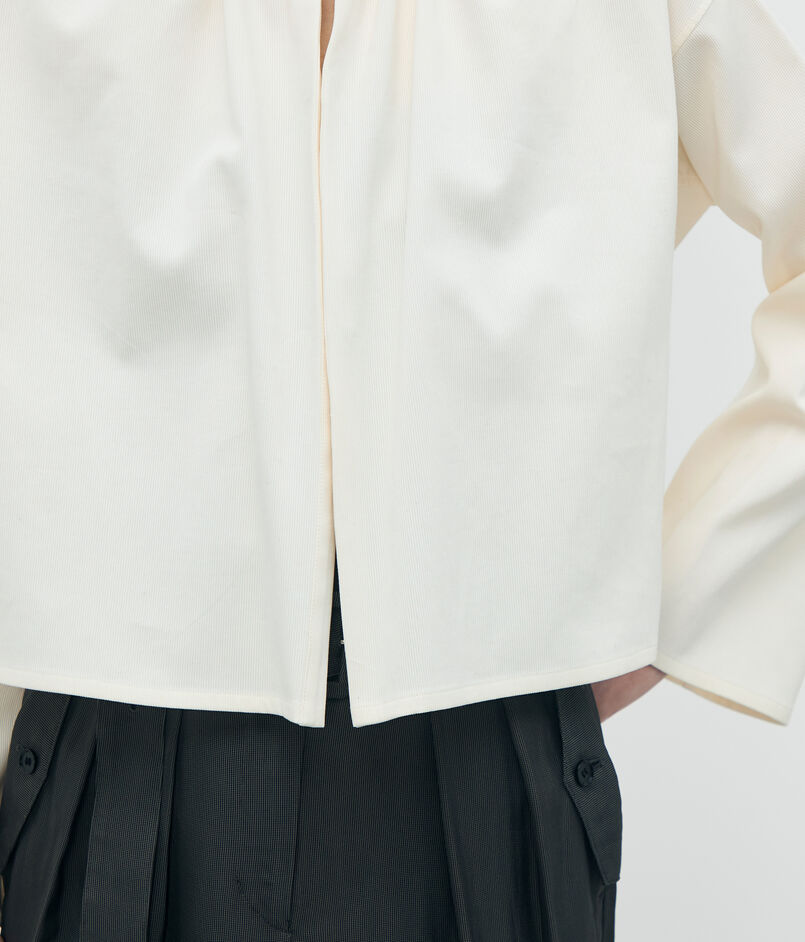 ボタン数をあえて抑えたフロントは、襟元のみを留めて抜け感を出したり、下のボタンを留めてミニマルに着こなすのもおすすめです。