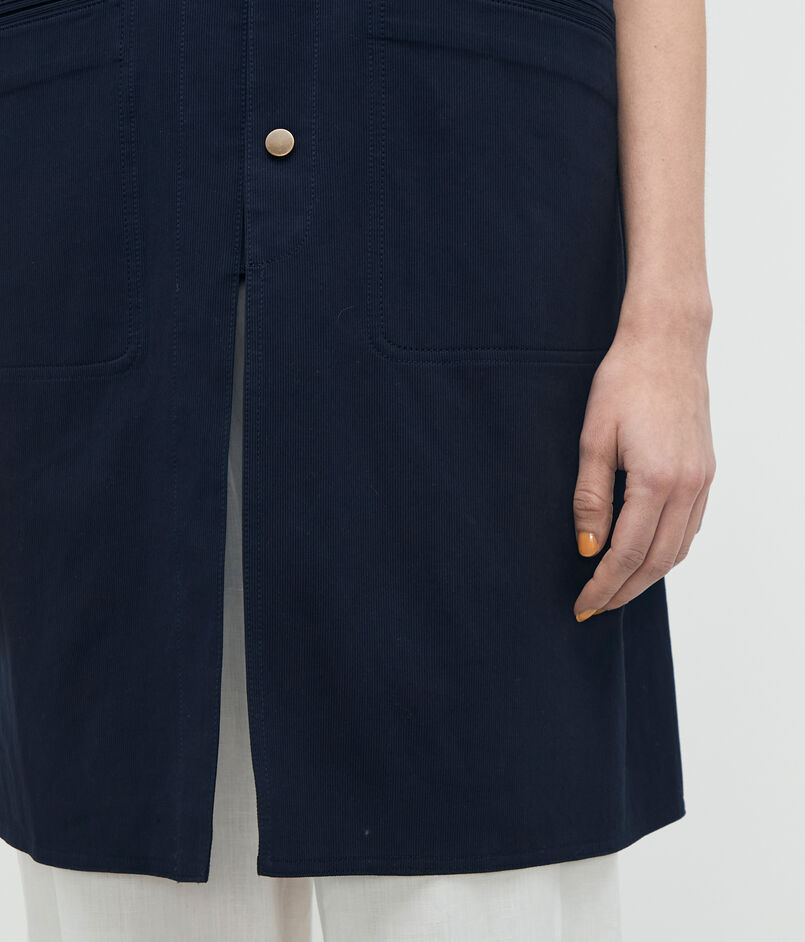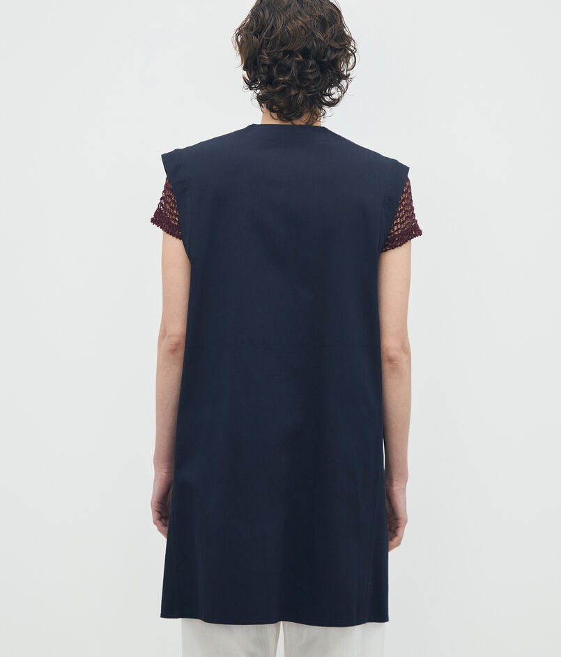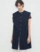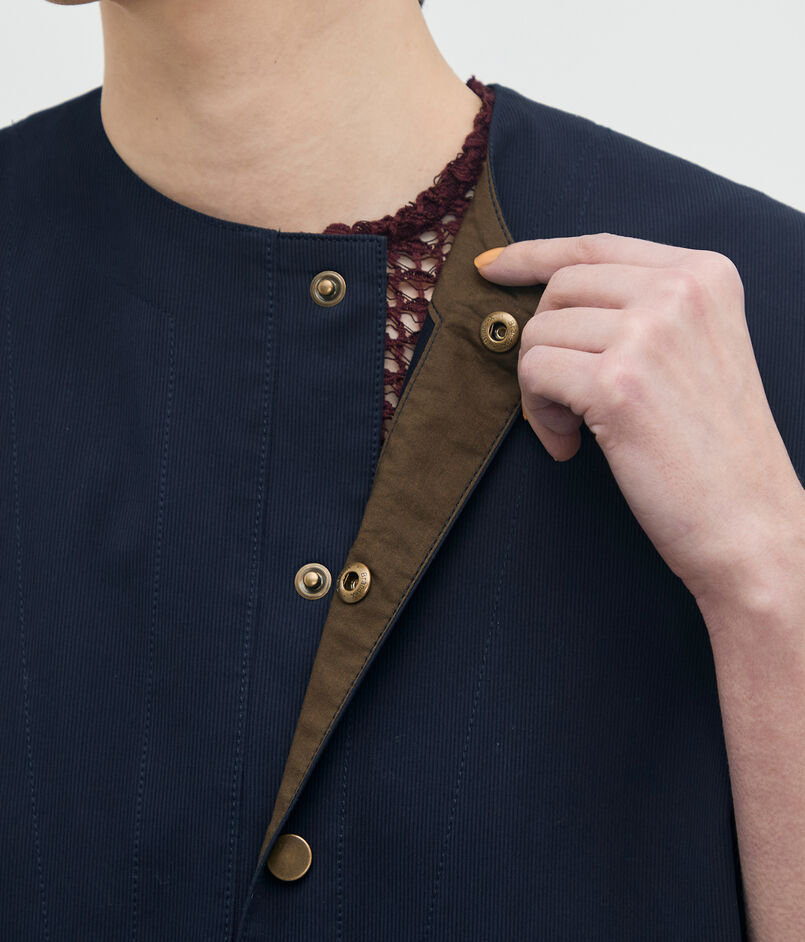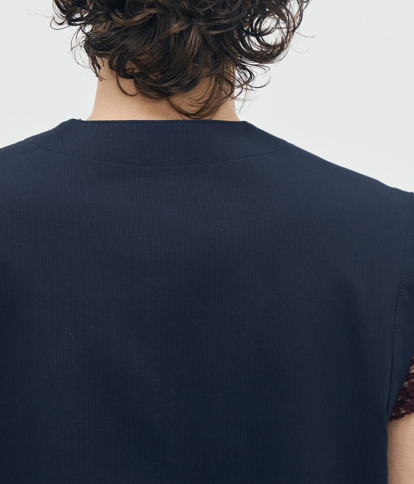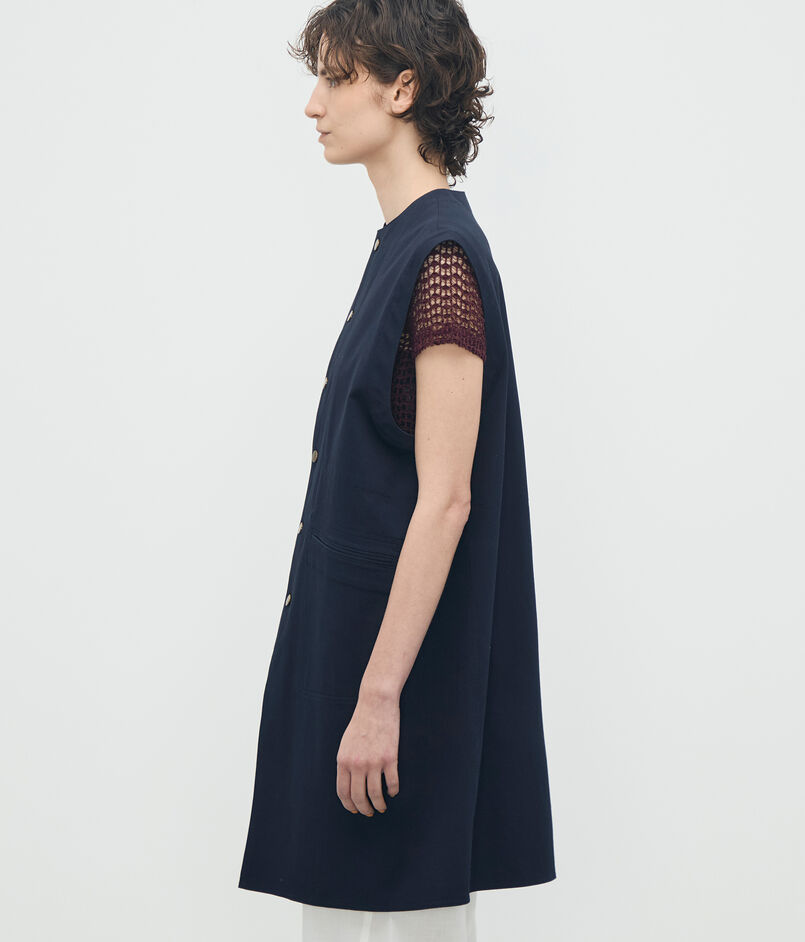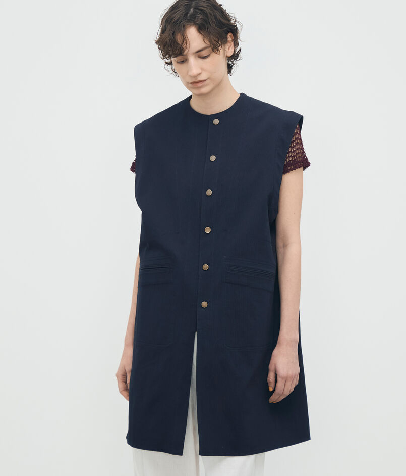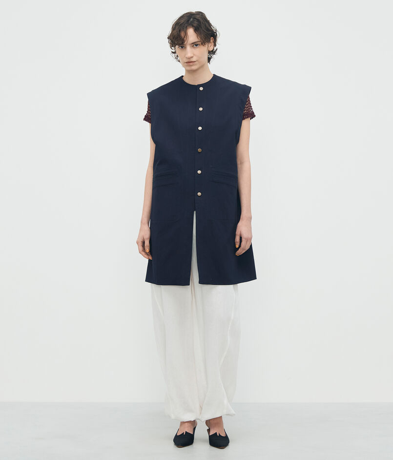 〈BACCA〉らしいマニッシュなカッティングとミドル丈のシルエットで、都会的なムードを演出するベスト。