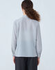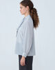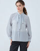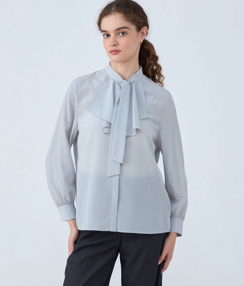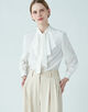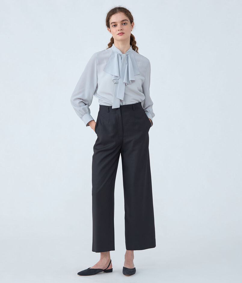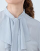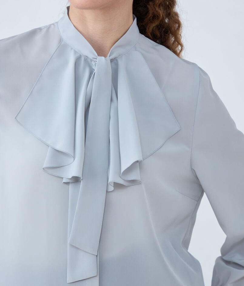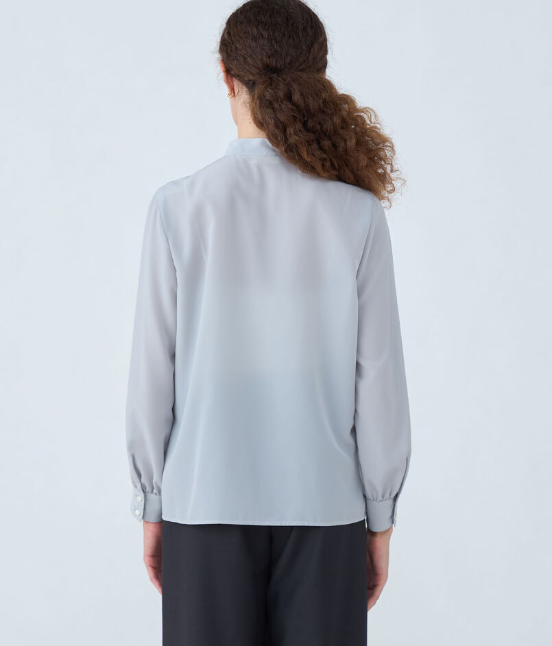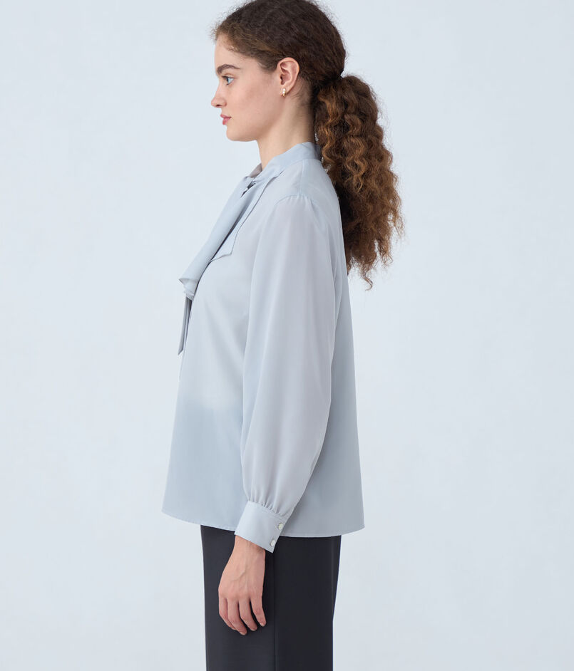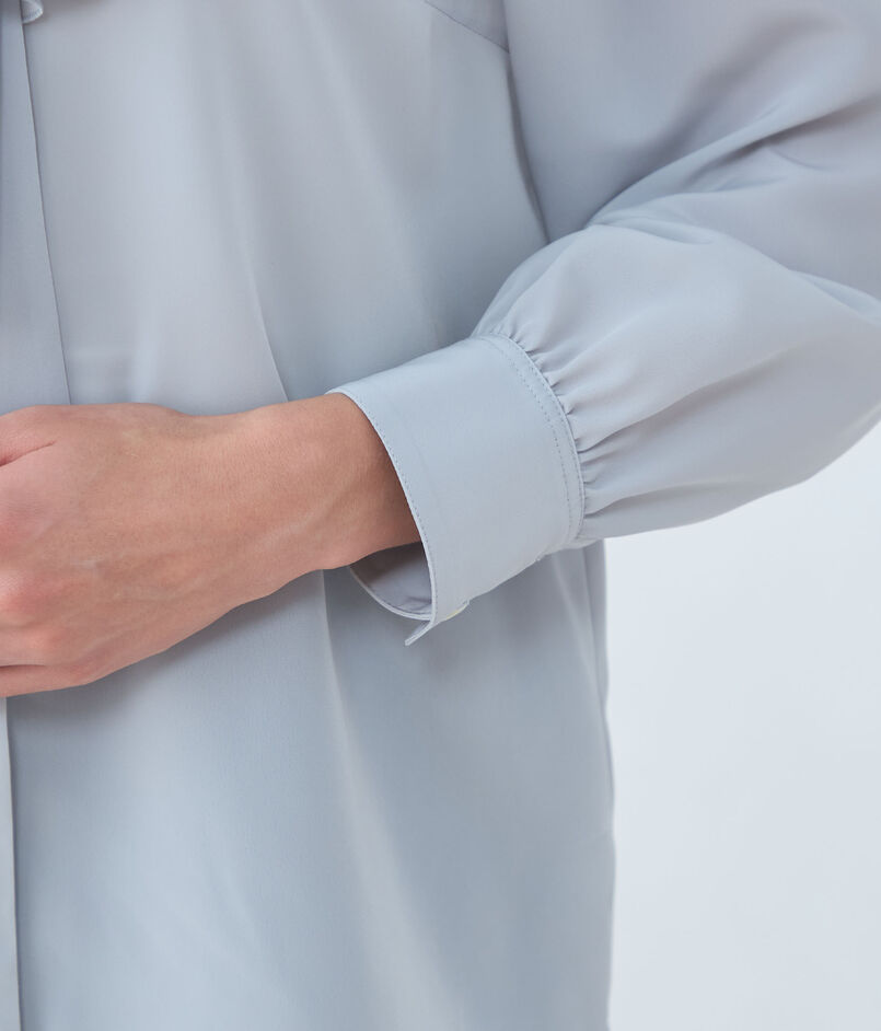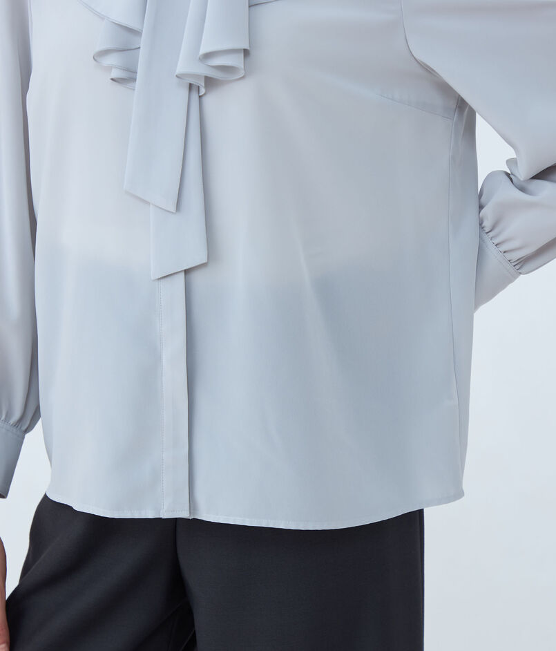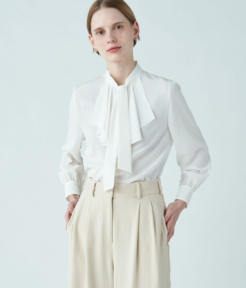 美しいドレープ性とパウダリーなタッチが魅力のポリエステルデシン素材を使用したブラウス。