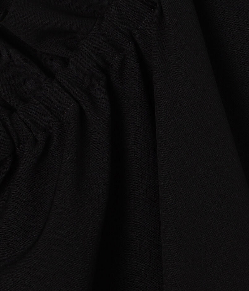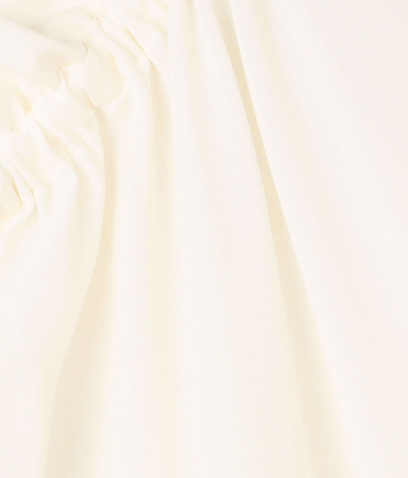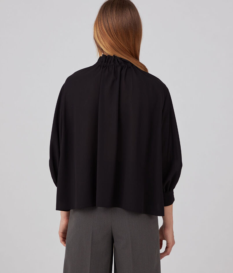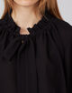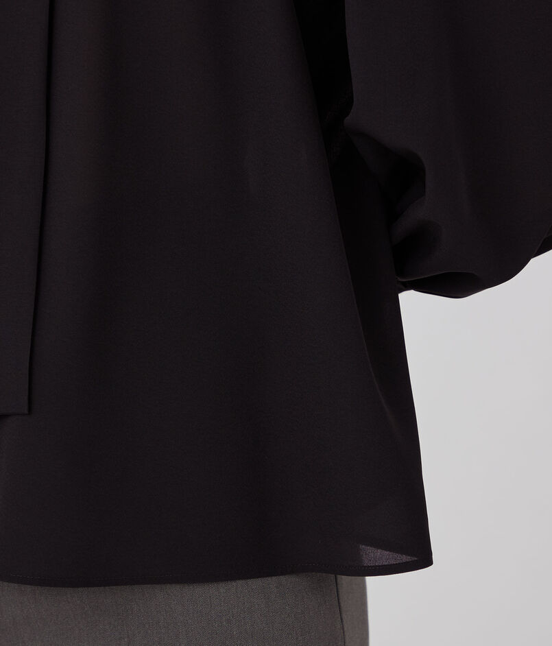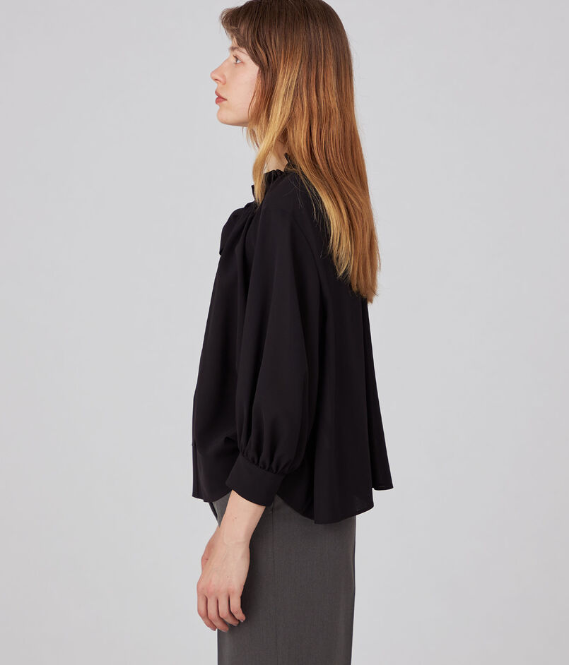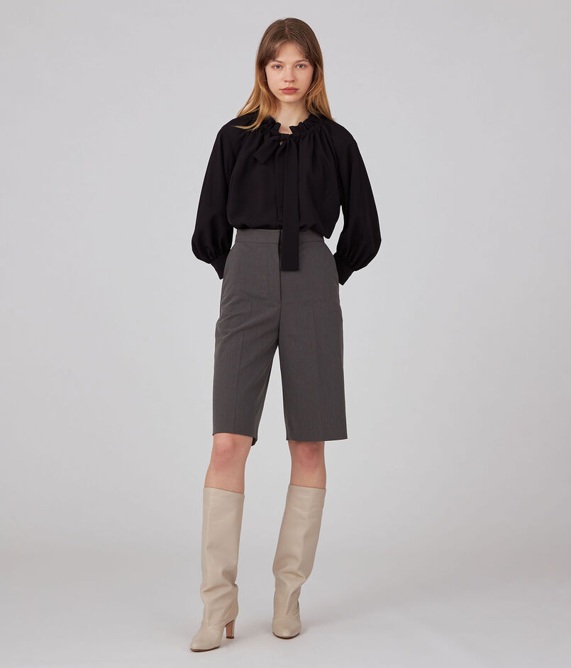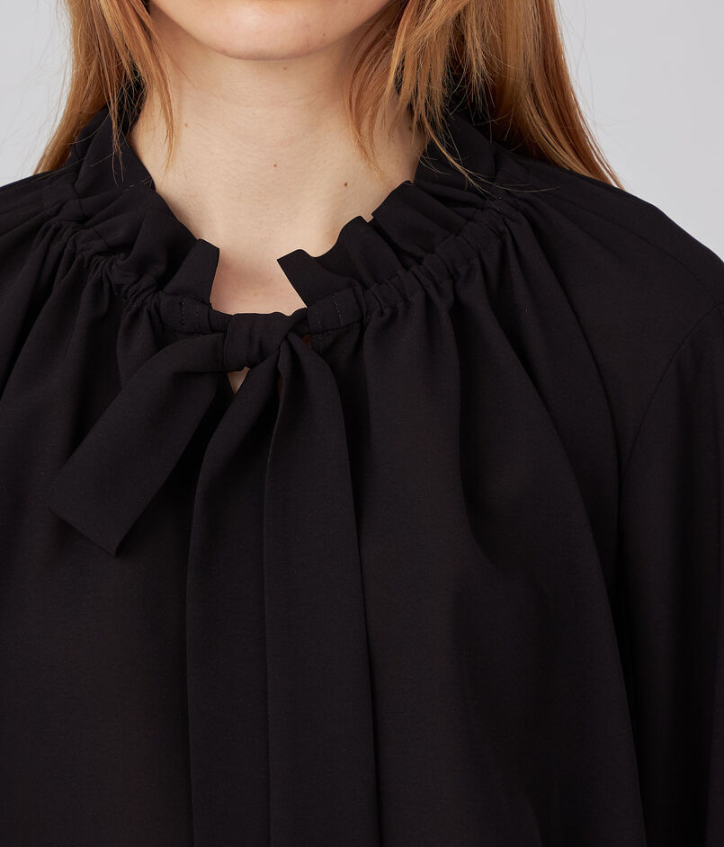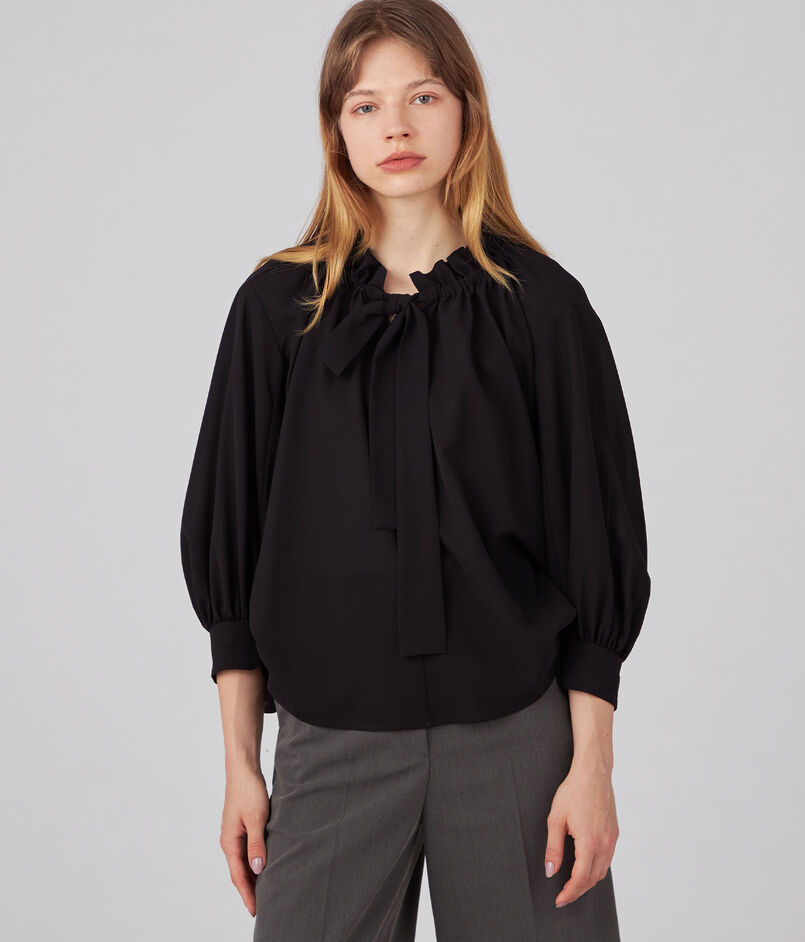 フリルネックブラウスは首元にたっぷりと寄せたギャザーにネックのフリル、太めのボウタイでフェミニンな雰囲気の一着。