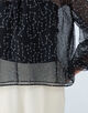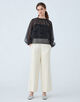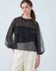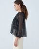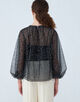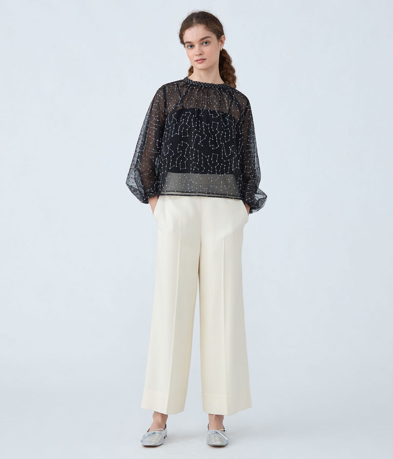 ブラウスはたっぷりとギャザーを寄せたテントラインにボリュームスリーブでフェミニンな印象の一枚。