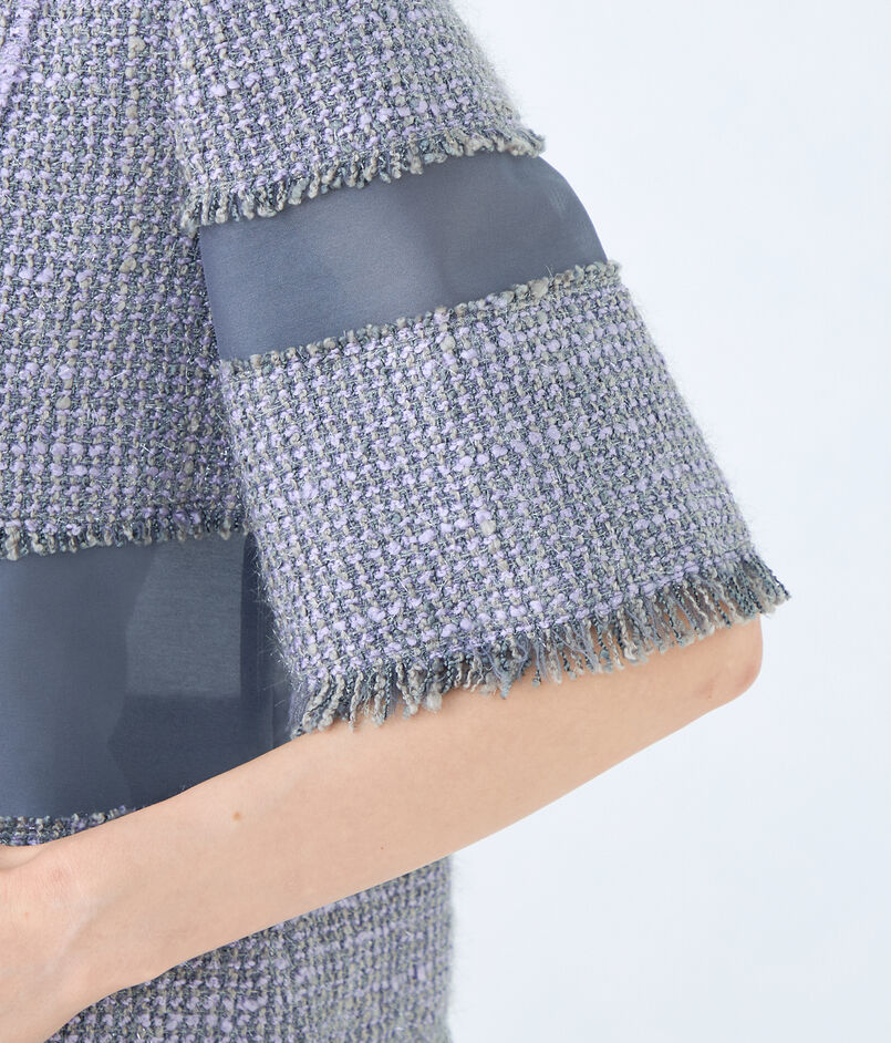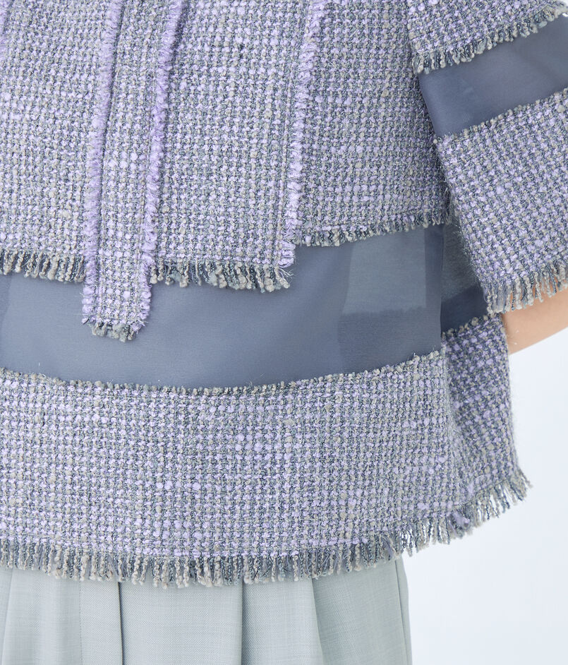 ツイードとハリのあるオーガンジー素材をブロッキングで切り替えることで素材のコントラストが生まれ、表情豊かなアイテムに仕上がっています。