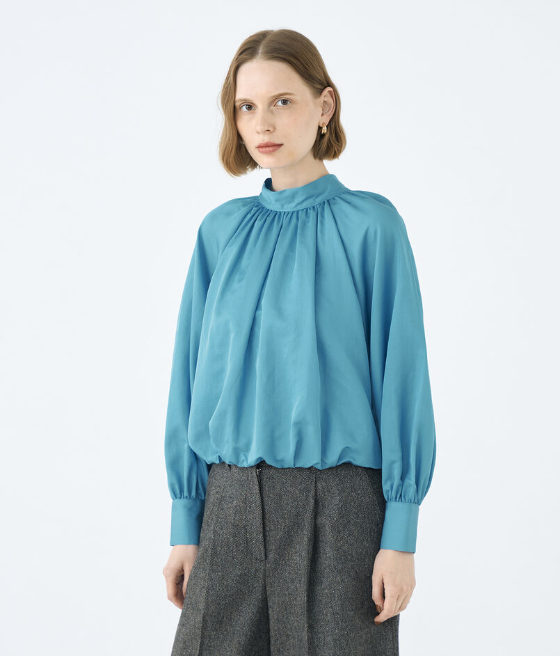 襟ぐりと裾にたっぷりと寄せたギャザーディテールが生み出すふんわりと丸みのあるシルエットでフェミニンな印象の一枚。