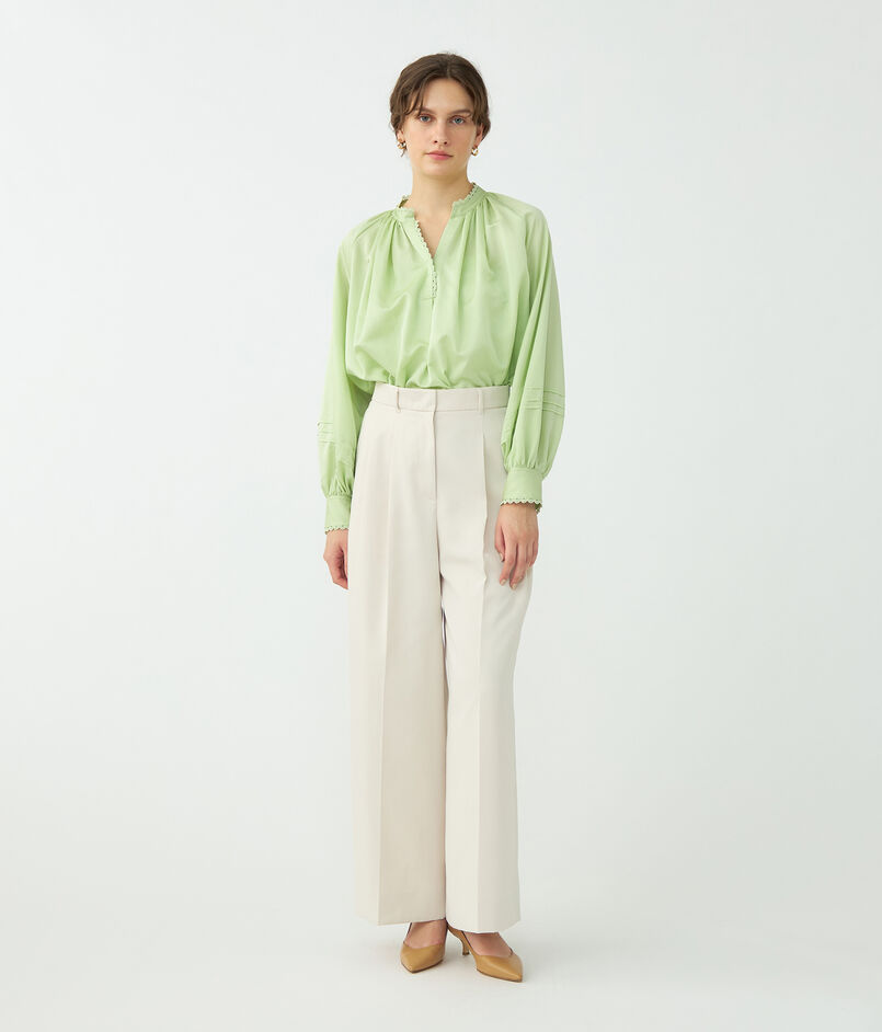 袖のピンタックディテールがアクセントになり、ジレなどとのレイヤードスタイルにもおすすめ。