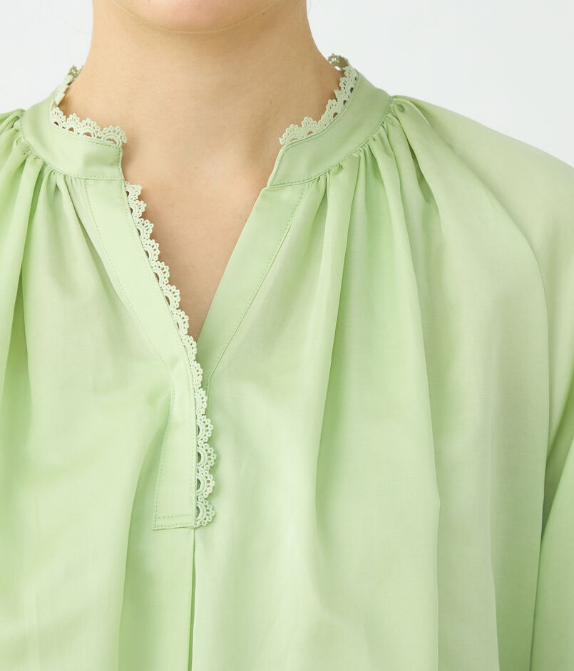 襟ぐりと袖口に細幅のレースをあしらったフェミニンな雰囲気の一枚。