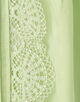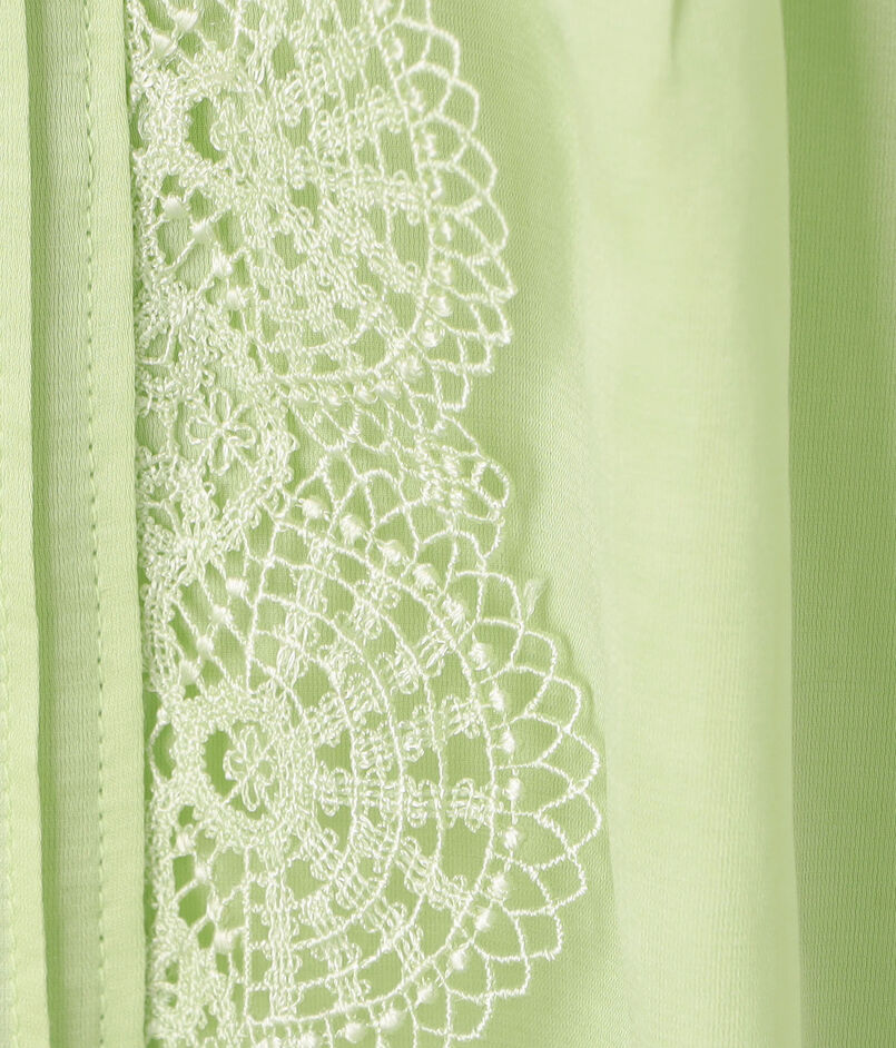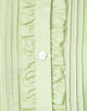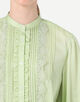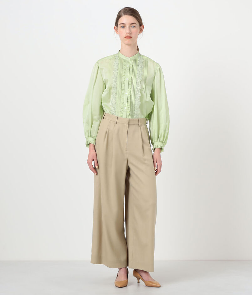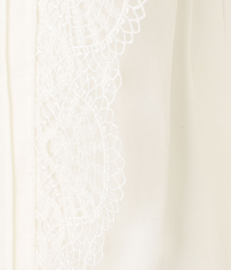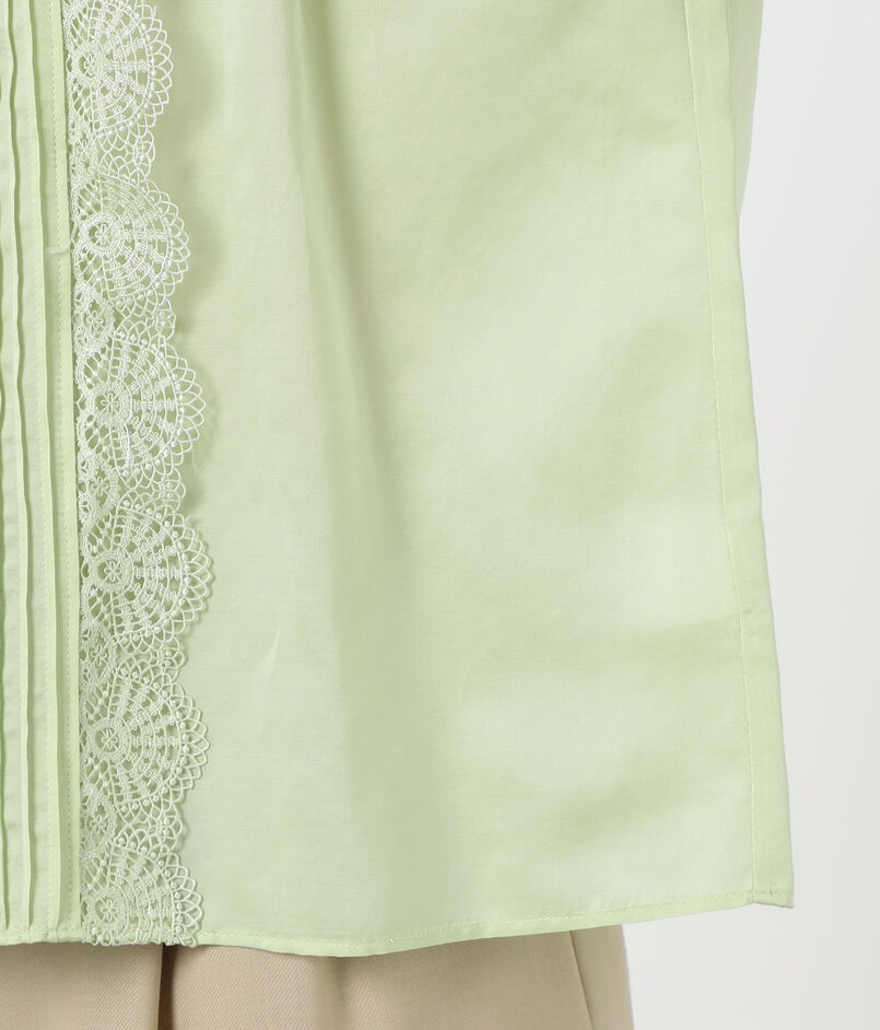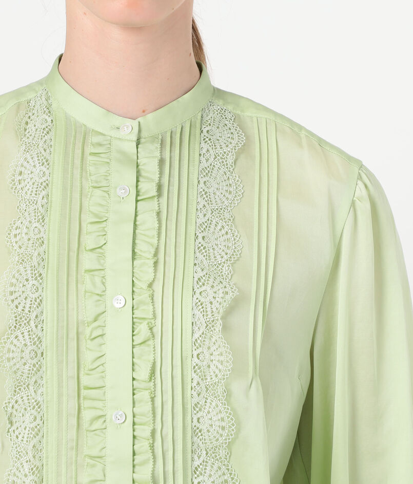身頃はすっきりとしたシルエットながら、ピンタックとレース、ピコカットのフリルなどフェミニンな要素を詰め込んだ一枚。