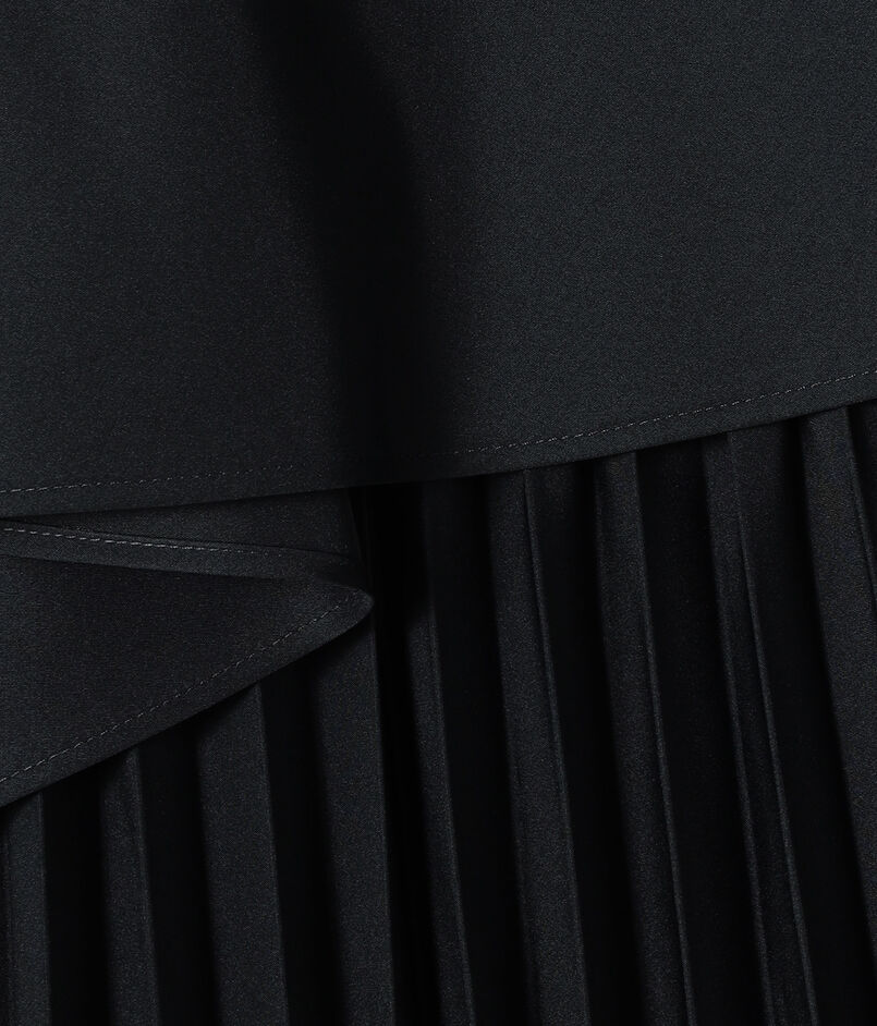 バスト下から広がるAラインシルエットにフロントのドレープディテール、動くたびに揺れ動くプリーツが上品な印象の一着。