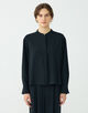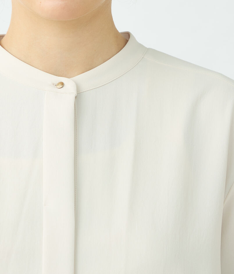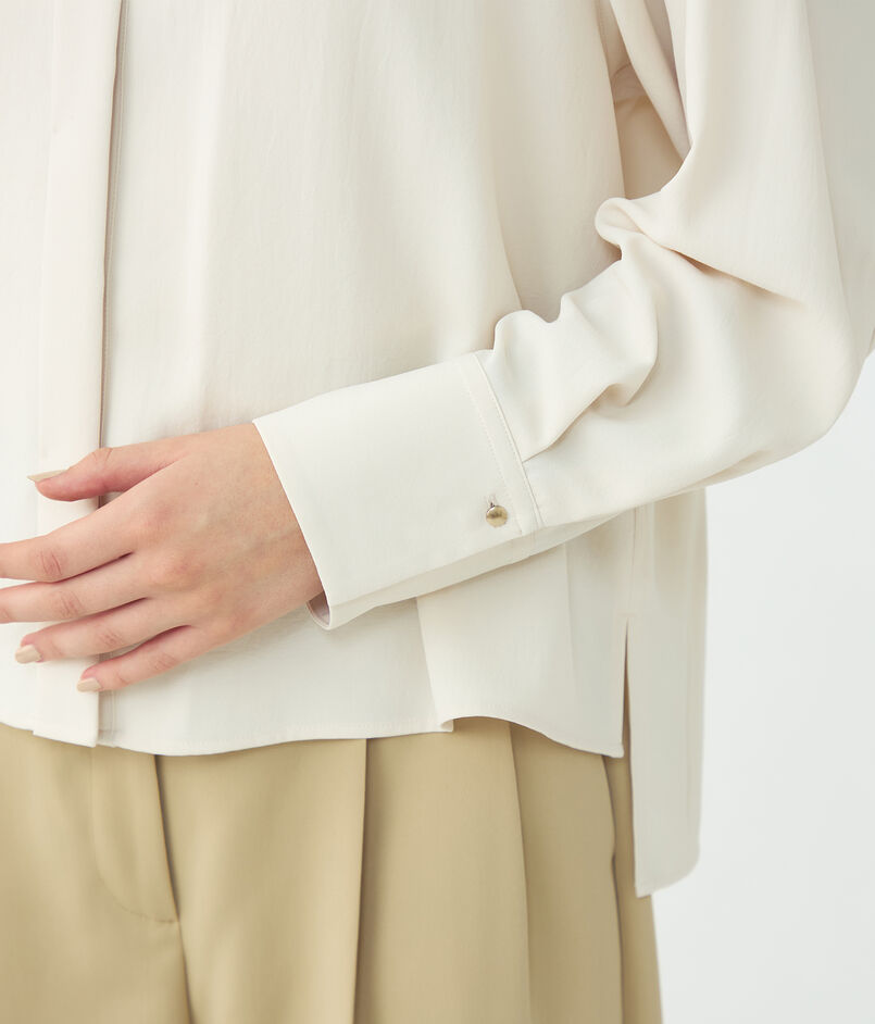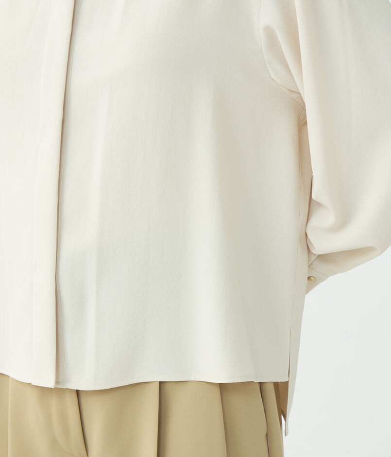しなやかな落ち感とろみのあるドレープ性が魅力的なポリエステルジョーゼット素材を使用したブラウス。