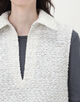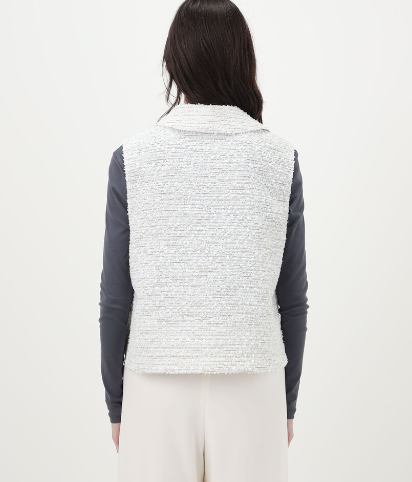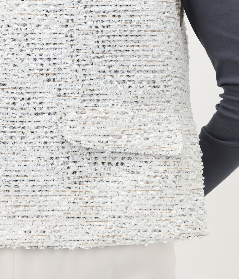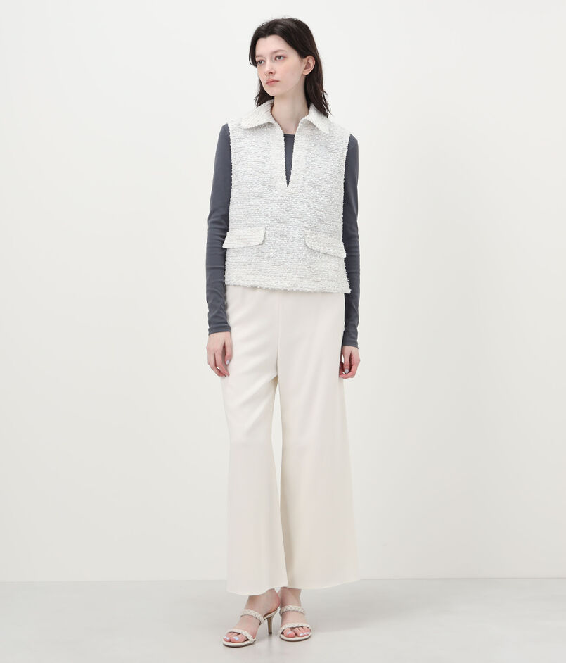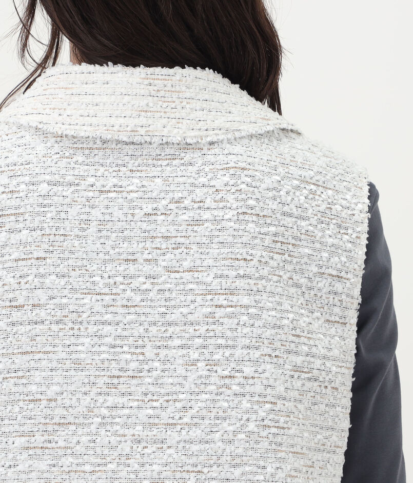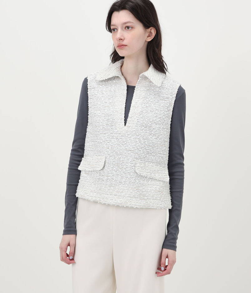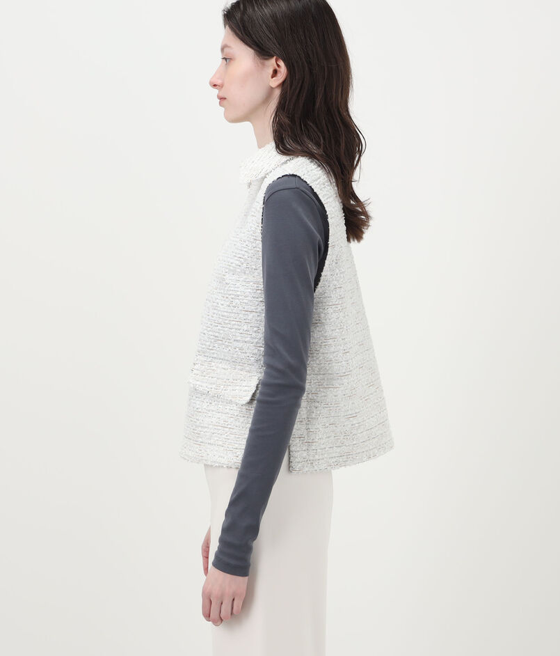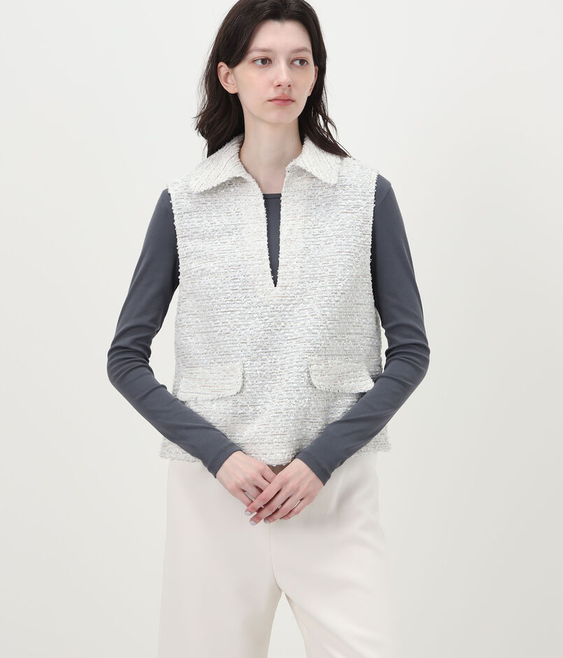 数種類の表情のある糸を織り込んで仕上げた、独特な凹凸感のあるツイード素材を使用したベスト。