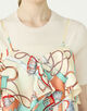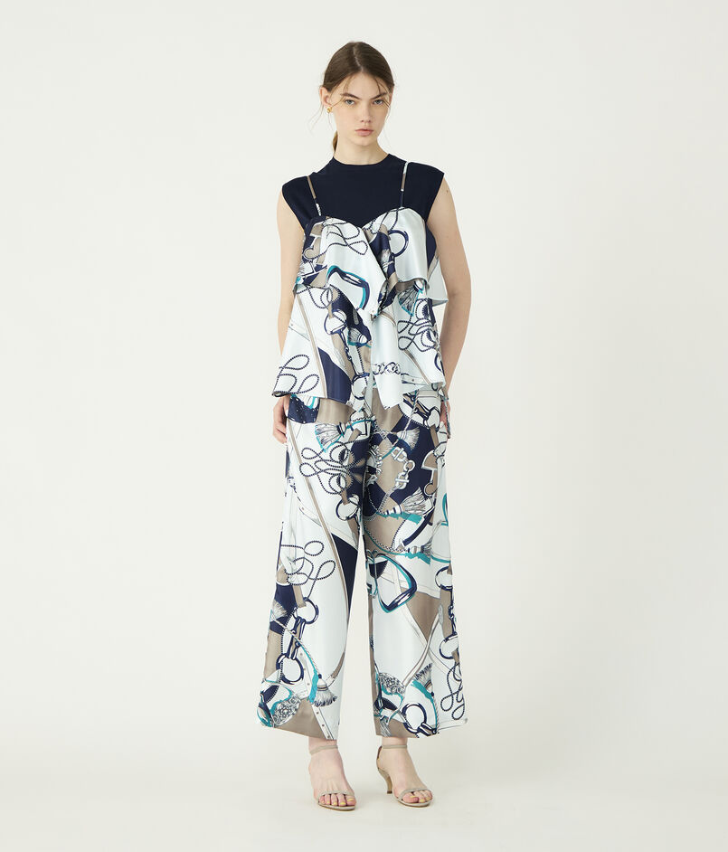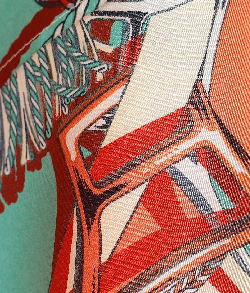 馬術用語の”旋回”をテーマに、馬具やタッセルなど動きのあるモチーフをリズミカルに配したデザインを、しなやかな落ち感のあるシルクタッチのポリエステルツイル素材にプリントしています。