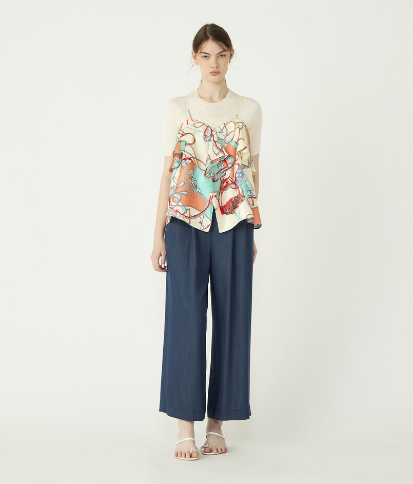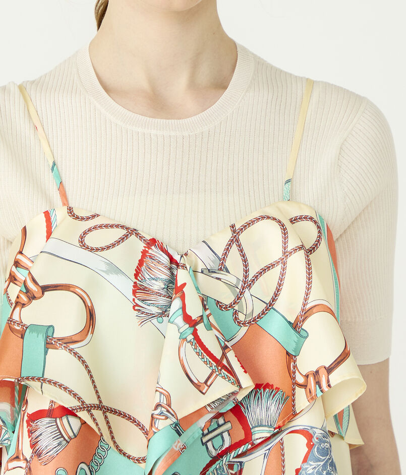 まるでスカーフを2枚贅沢に重ねたような、立体的でドラマチックなカッティングがデザインポイントのキャミソールブラウス。
