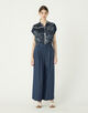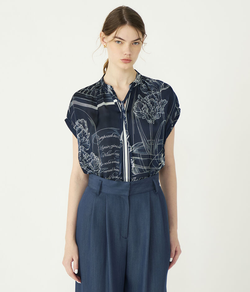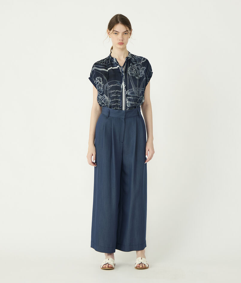 フラワーモチーフの可憐さとセンターのライン使いのモダンさが絶妙に調和し、纏うだけで洗練された着こなしが決まるアイテムです。