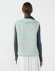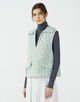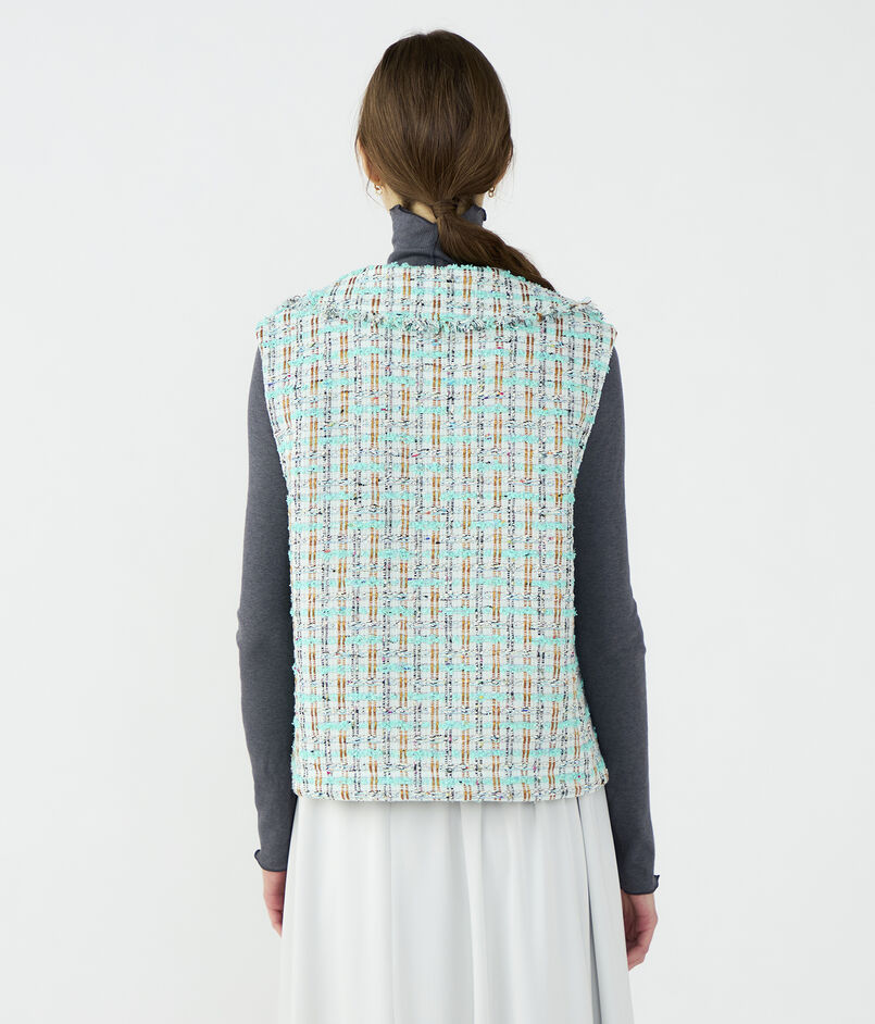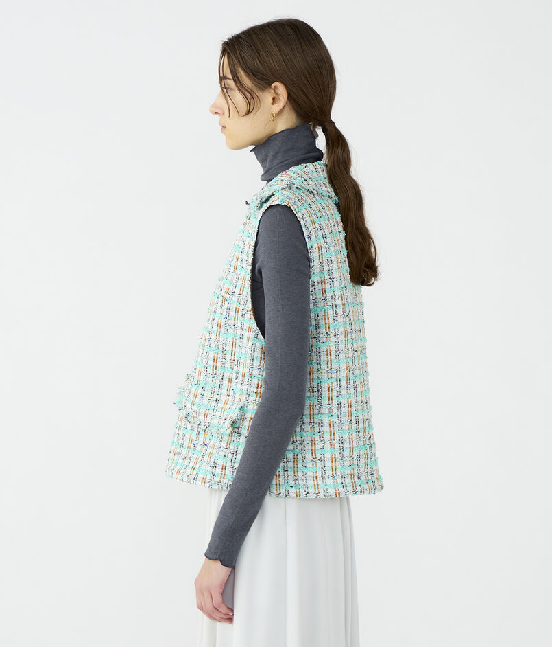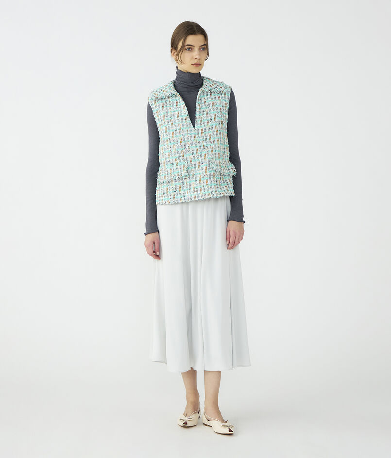 ベストは大きめの襟と深めのスキッパーあきがデザインポイント。