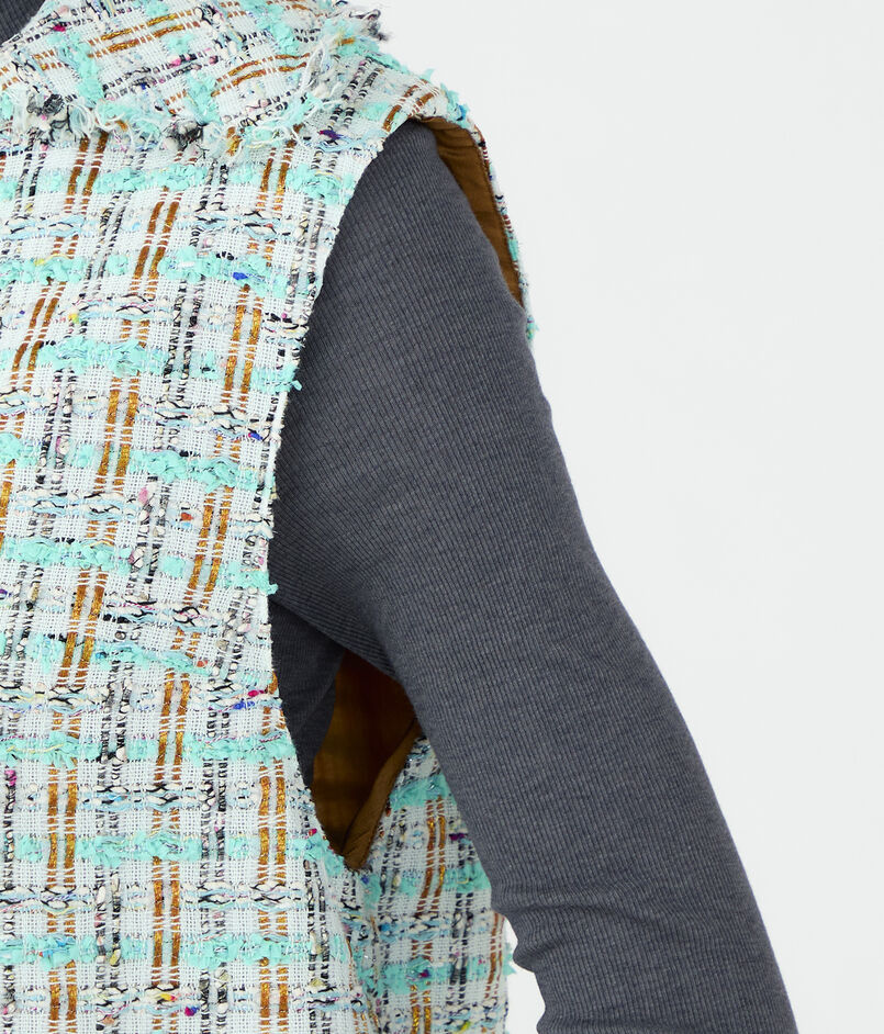 ボクシーなシルエットに広めのアームホールで合わせるインナーを選ばず、さまざまなレイヤードスタイルをお楽しみいただけます。
