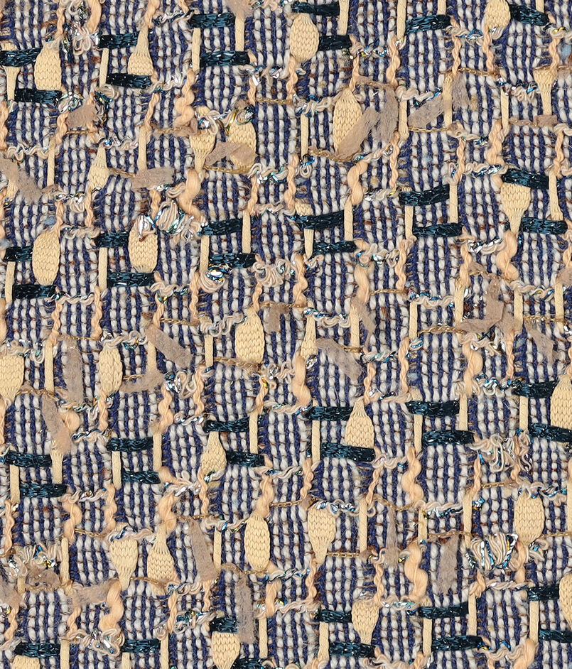パイ生地を表現するように繊細なベージュやクリーム色の糸、さらにシルバーやターコイズのラメ糸を織り込むことで、まるで宝石を散りばめたかのような輝きを生み出しています。