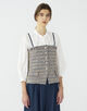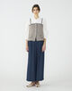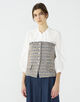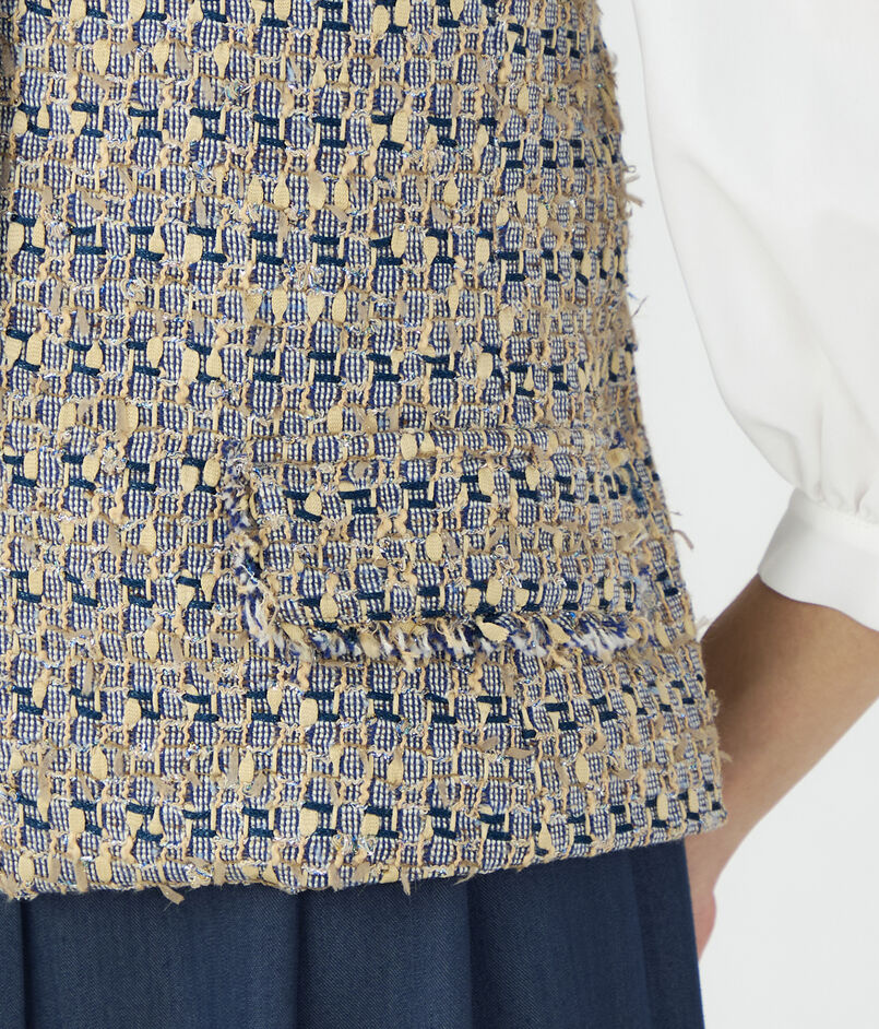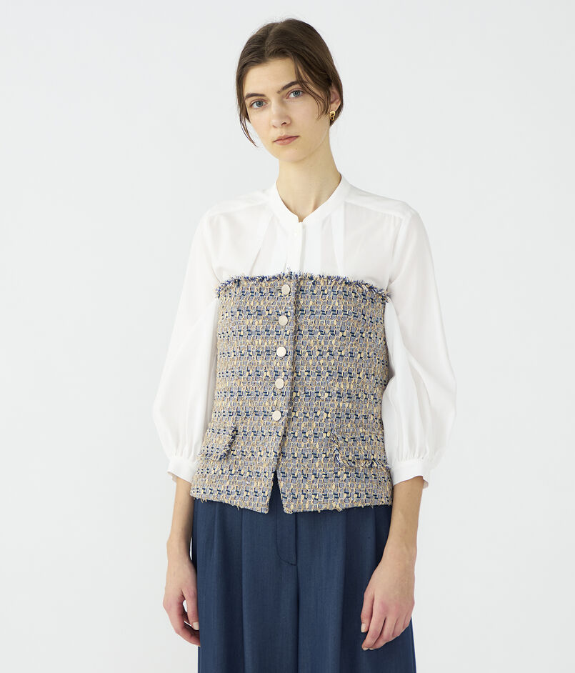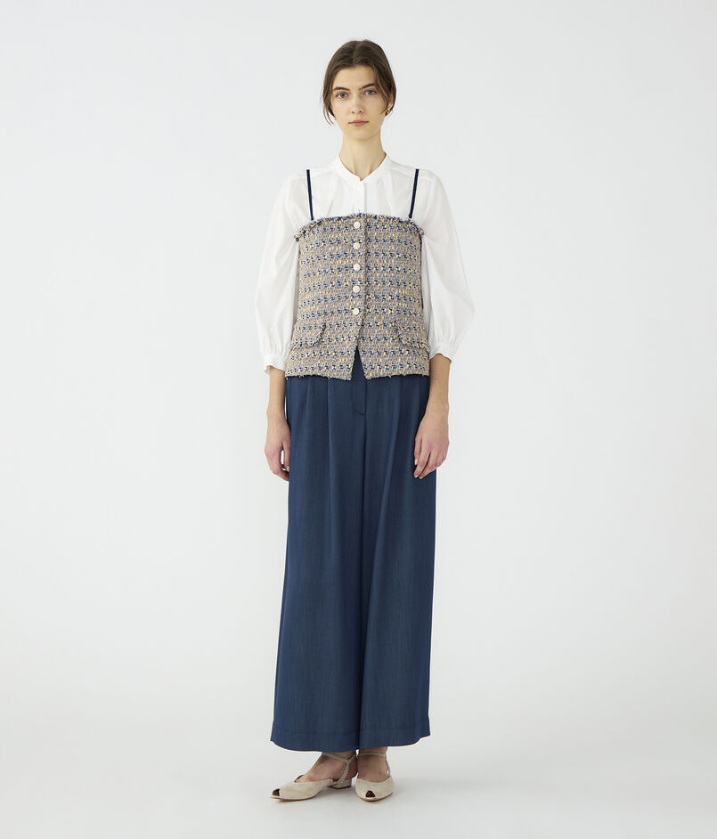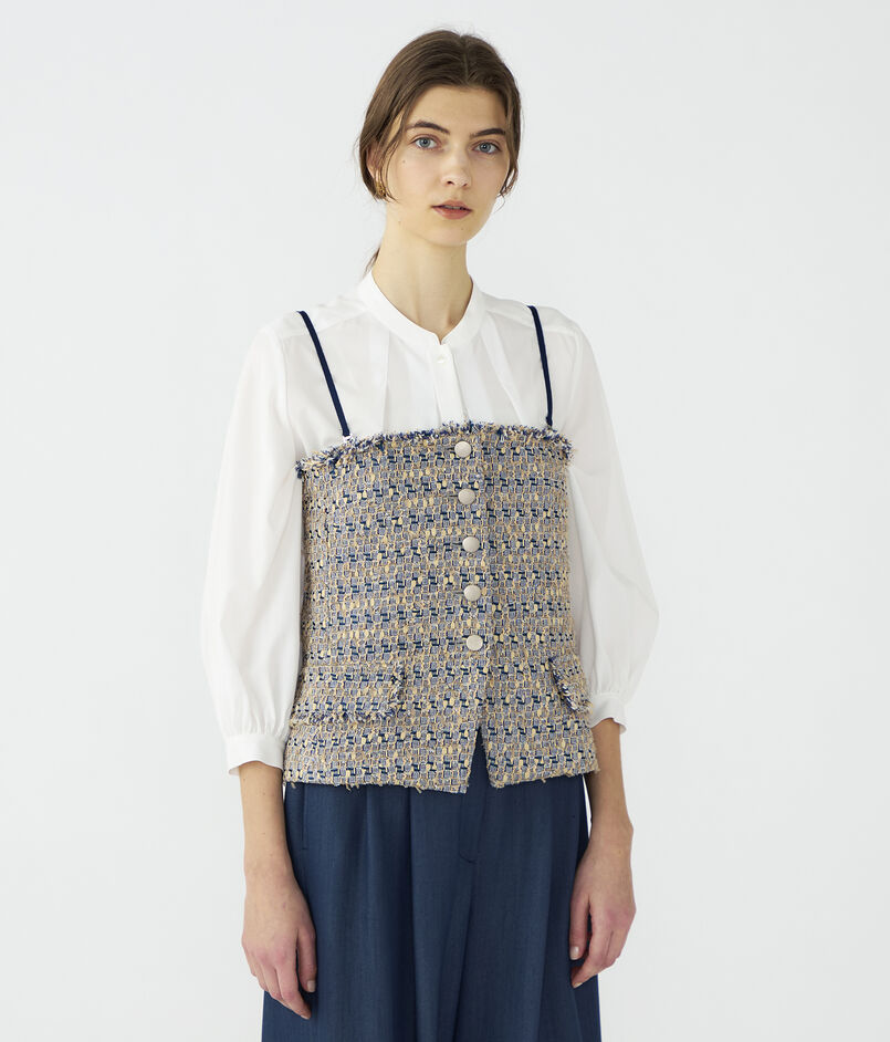 ビスチェはジャケットライクなフラップポケットでマニッシュさがありつつも、身体のラインに沿った曲線で女性らしく着こなせる一枚。