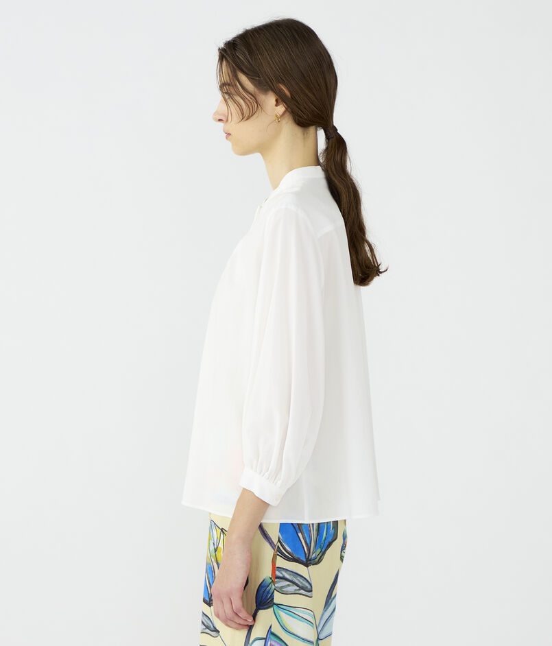 ふんわりとしたスリーブに控えめなスタンドネックでクラシカルな雰囲気でお召しいただけます。