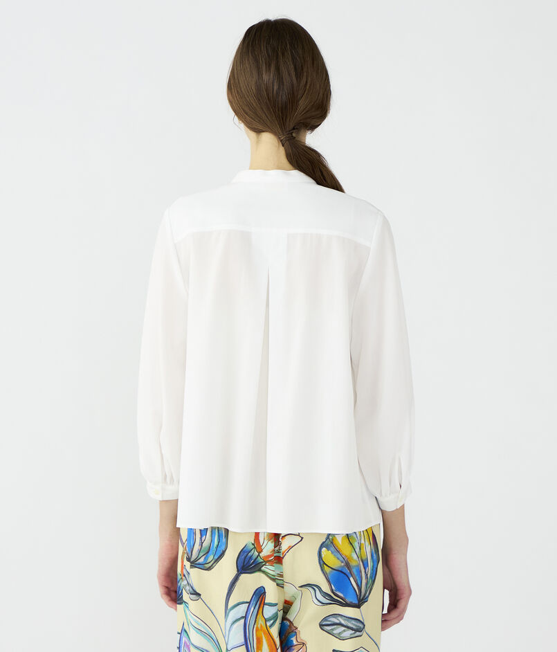 襟元のタック使いと袖口のギャザーがデザインポイントのブラウス。
