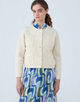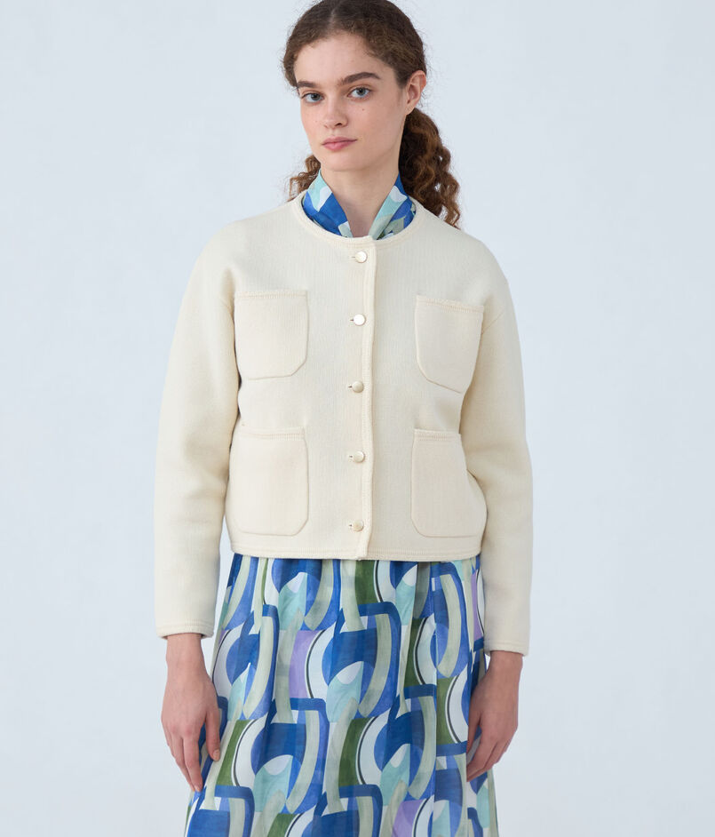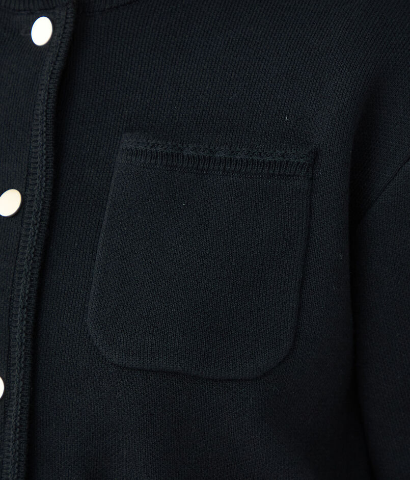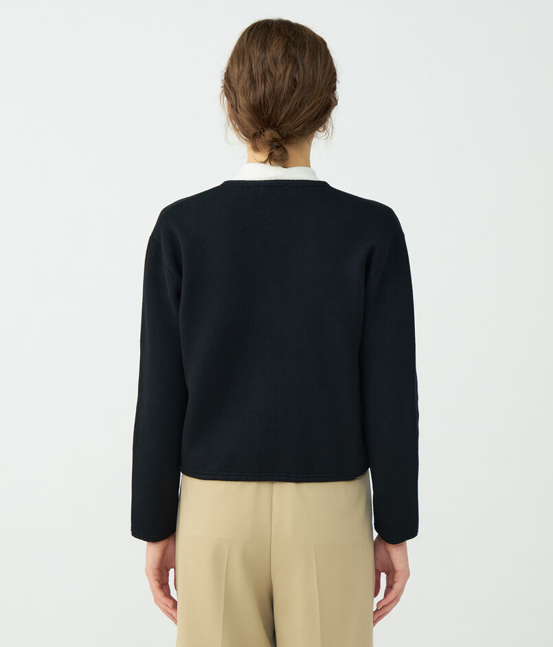 膨らみのあるコットンポリエステルのダブルフェイスニット素材のカーディガン。