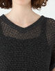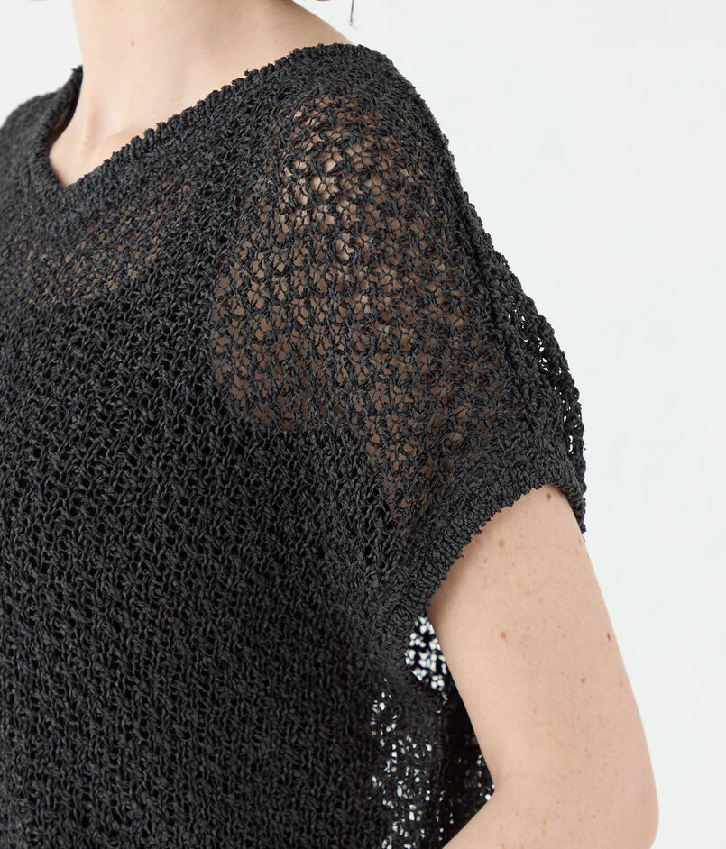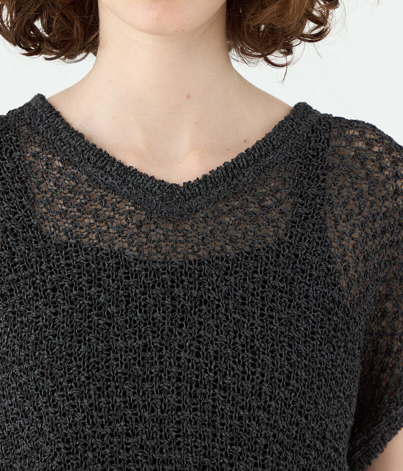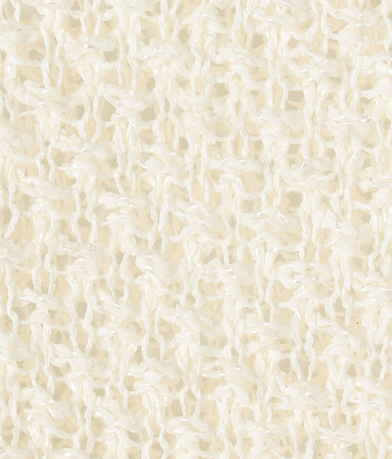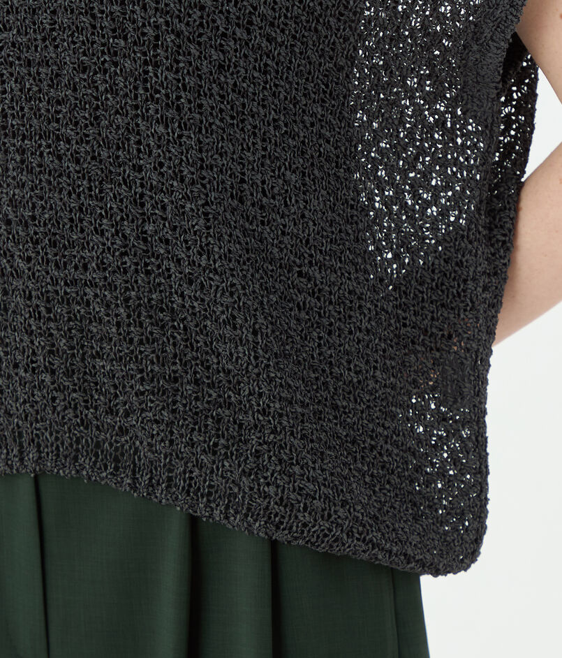 和紙にレーヨンコットンを撚糸した糸と和紙アクリルの撚糸の2素材を組み合わせ、透かし柄に編み上げています。