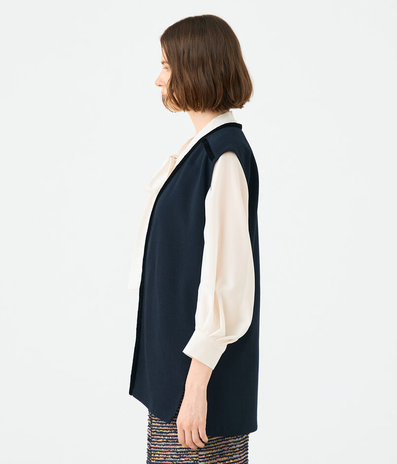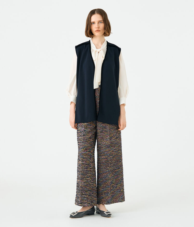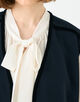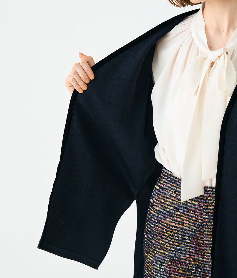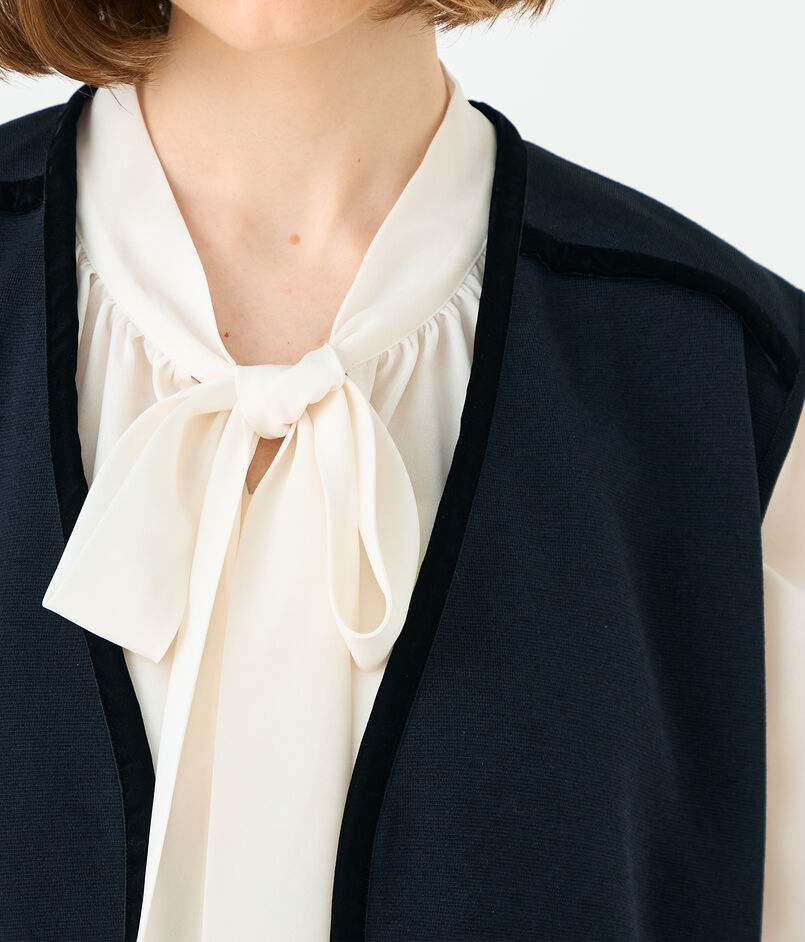 ボウタイブラウスやワンピースなどとレイヤードしたり、カットソーやデニムパンツと合わせてカジュアルダウンしたスタイリングもおすすめ。