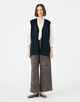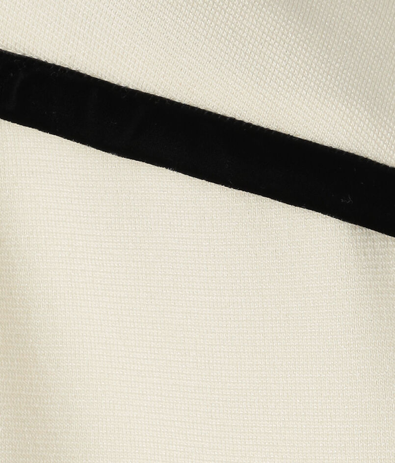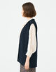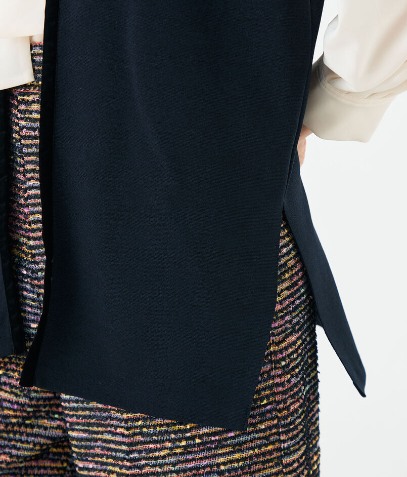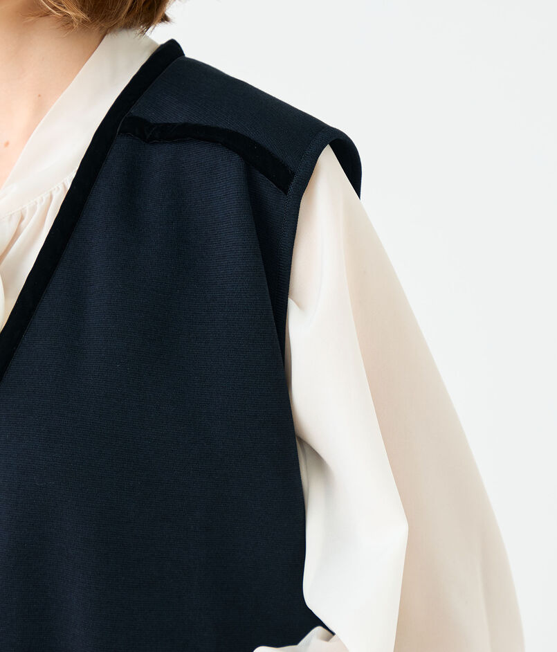 シンプルなデザインのVネックジレは。ショルダーラインや前立てにベルベットテープを施すことでシックかつ洗練された雰囲気をプラスした一枚です。