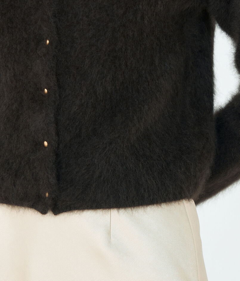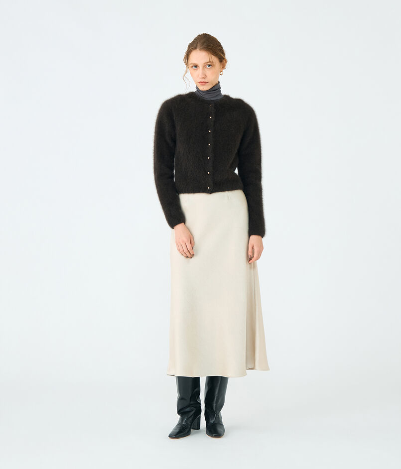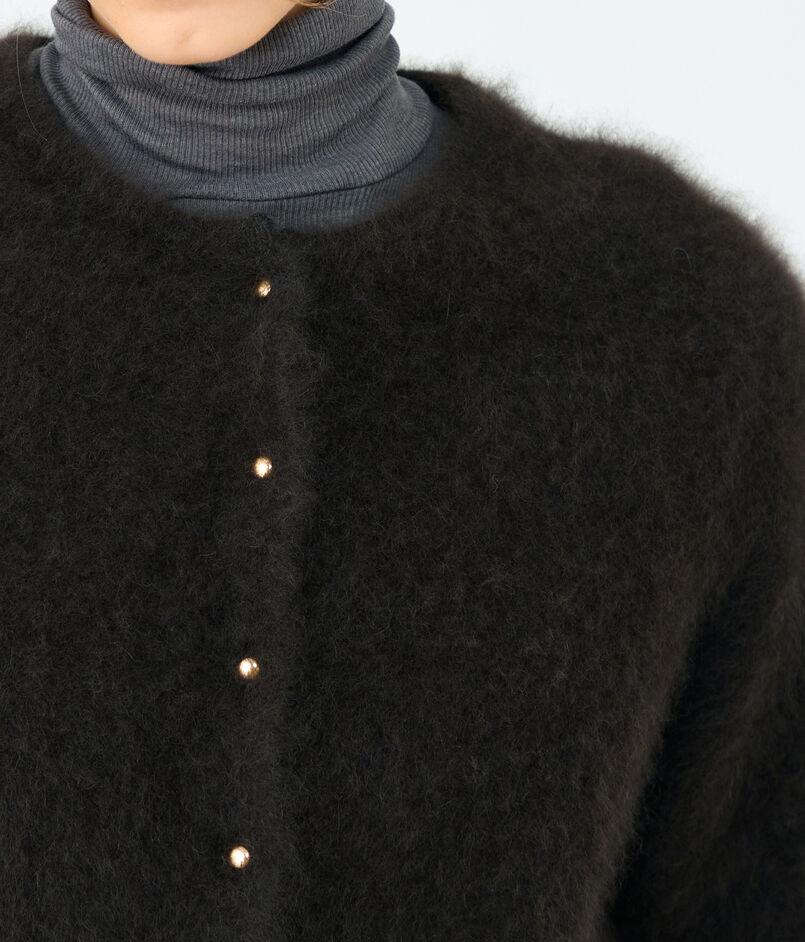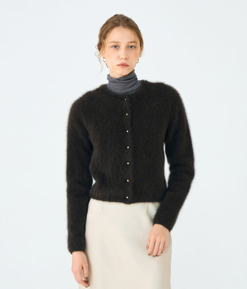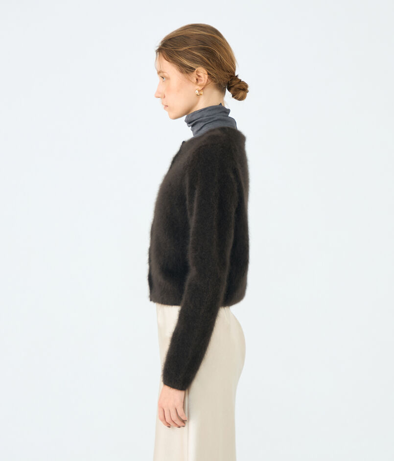 カーディガンはトレンド感のあるショート丈でワンピースやボリュームのあるボトムスとも相性抜群の一枚。