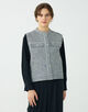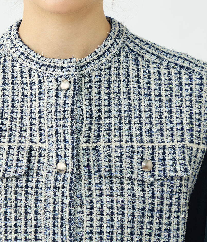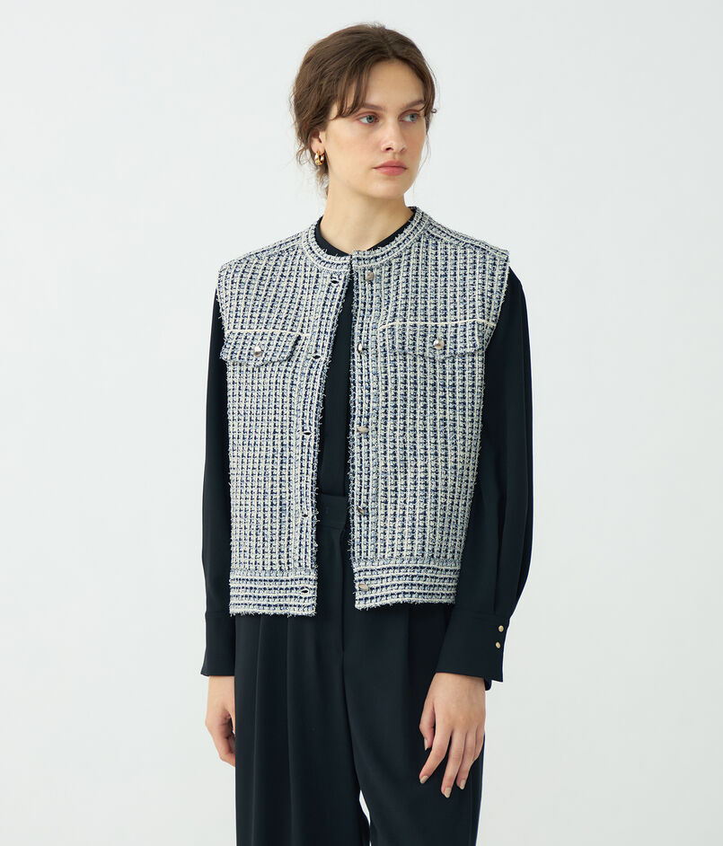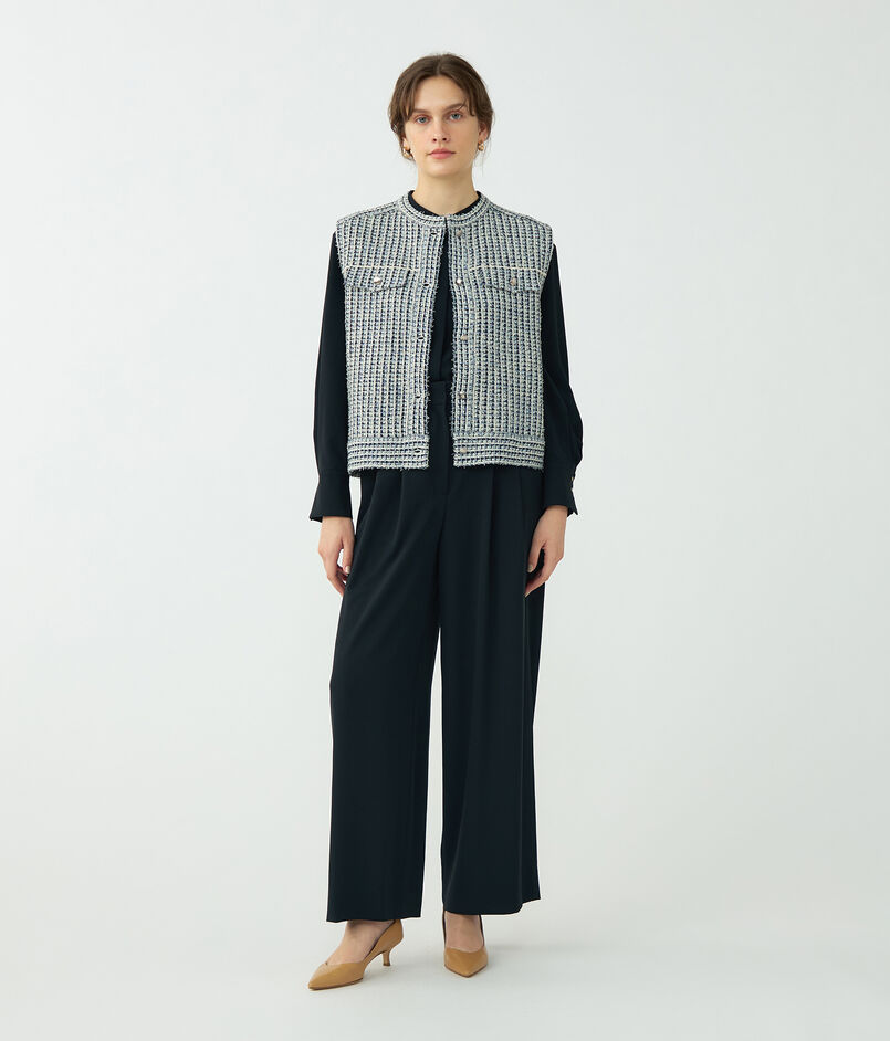 ベストはフロントに配したフラップポケット風のディティールやメタルボタンがデザインポイント。