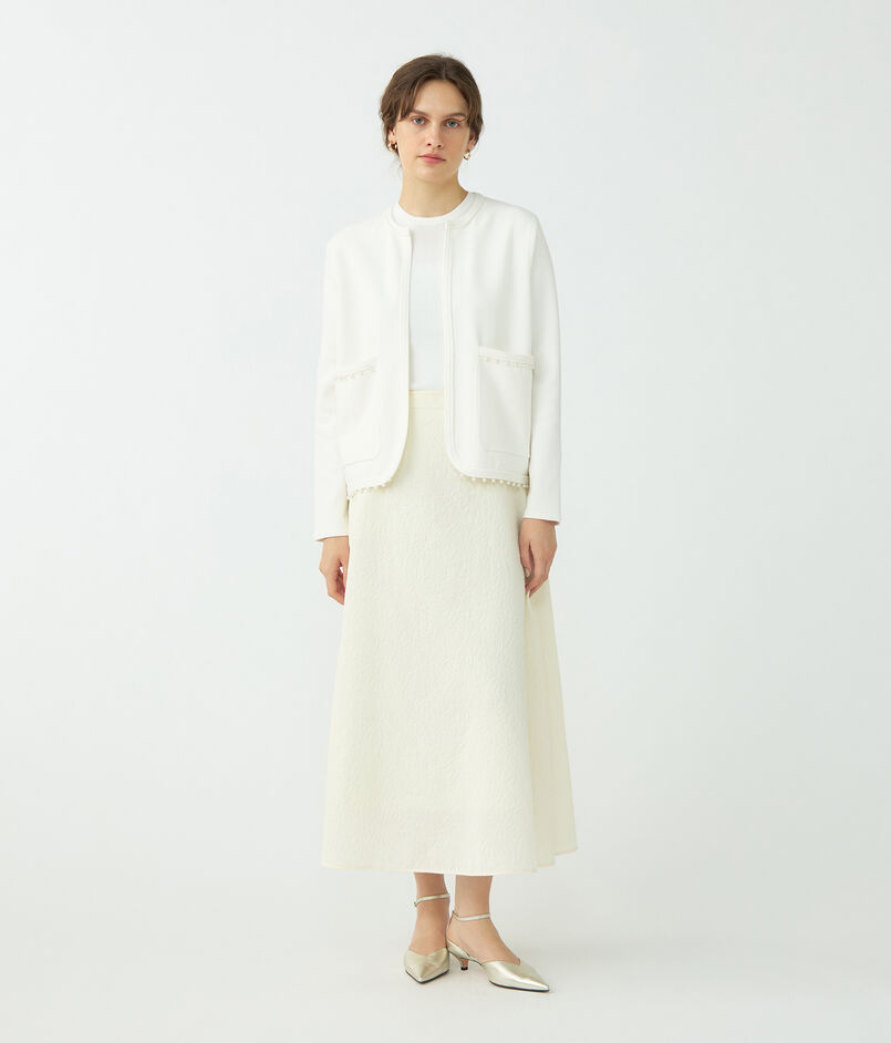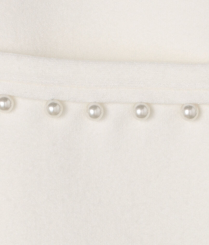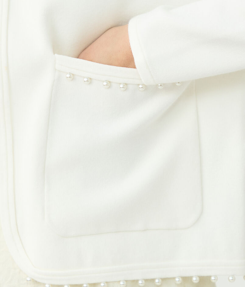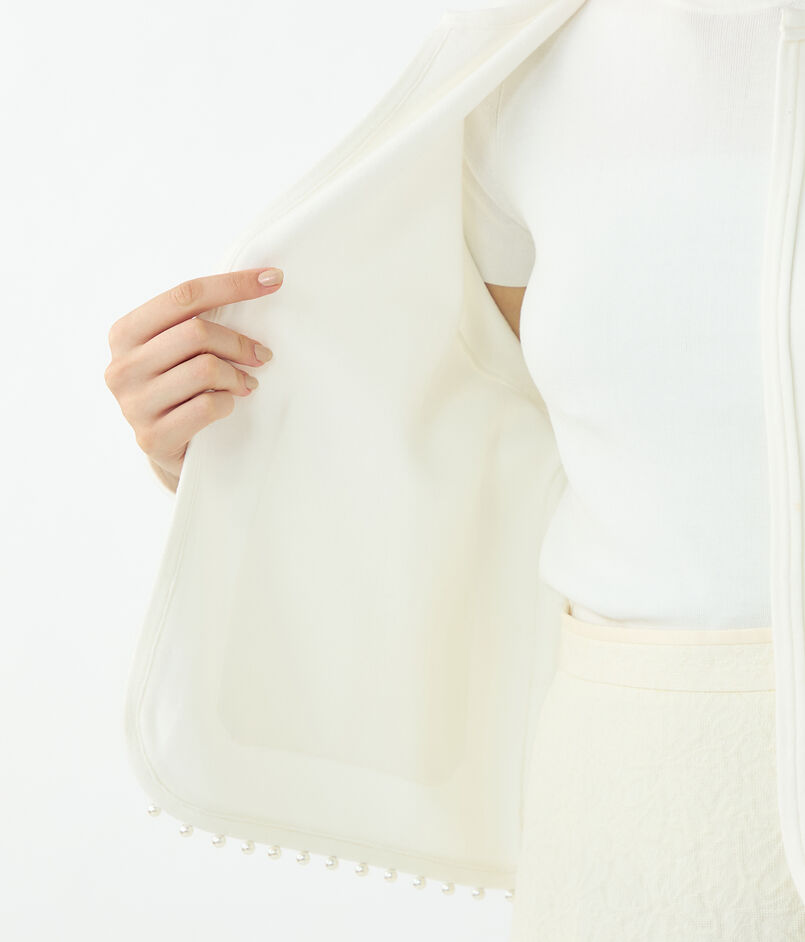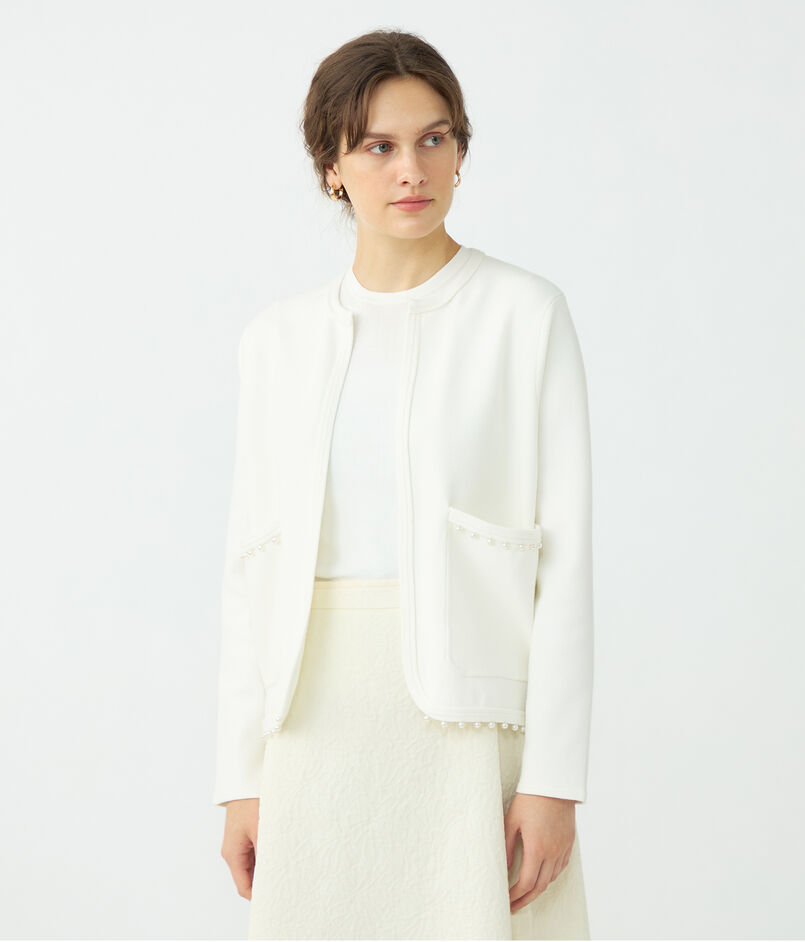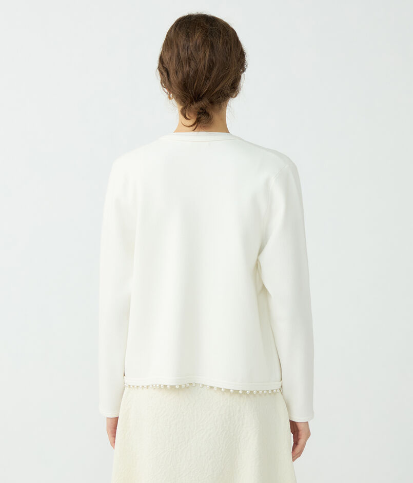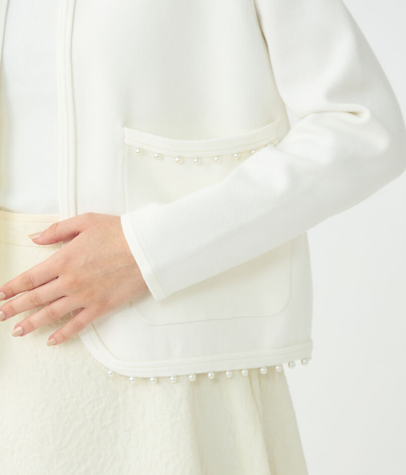 裾とポケットに配したパールビーズが上品なアクセントのニットカーディガン。