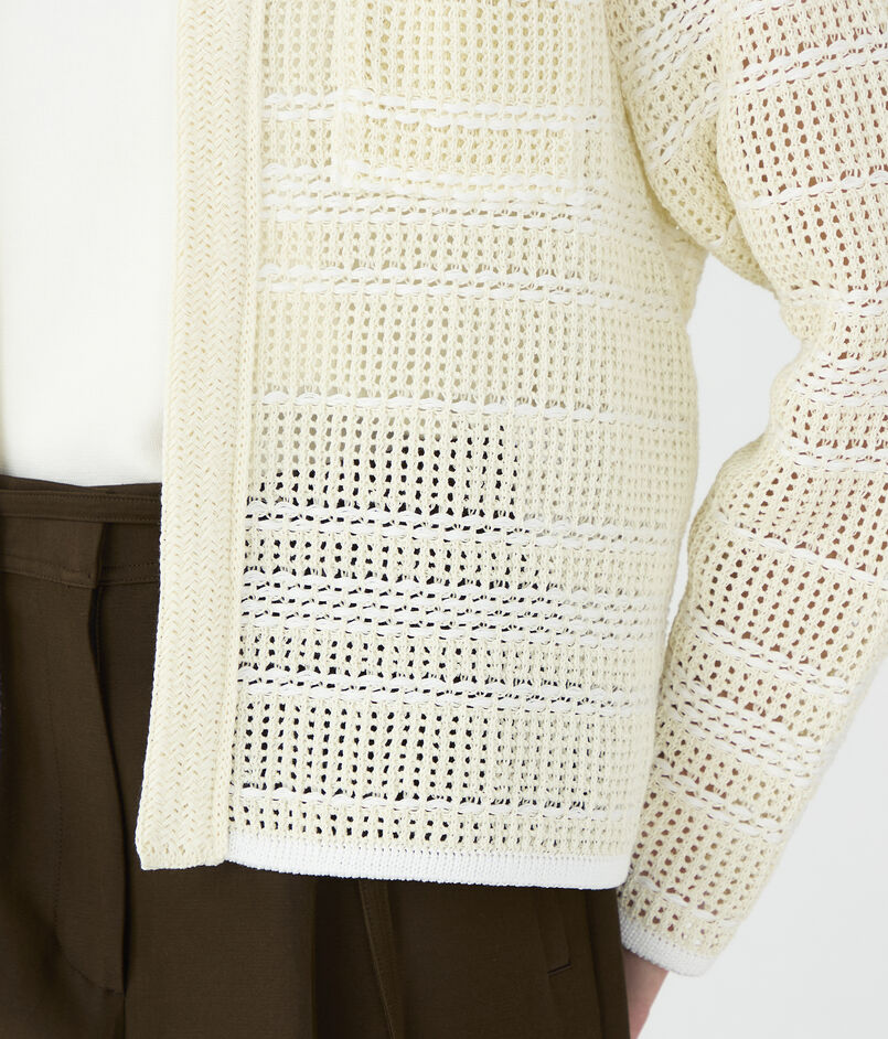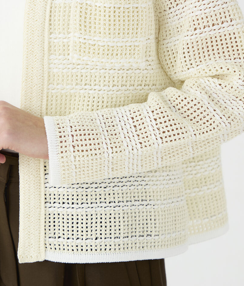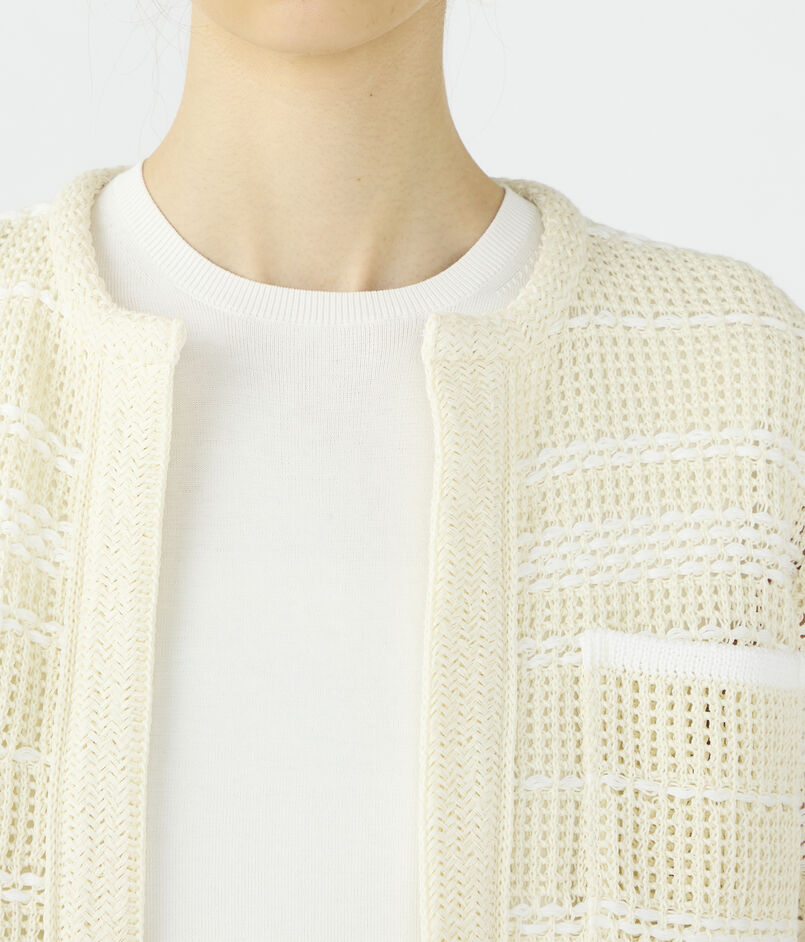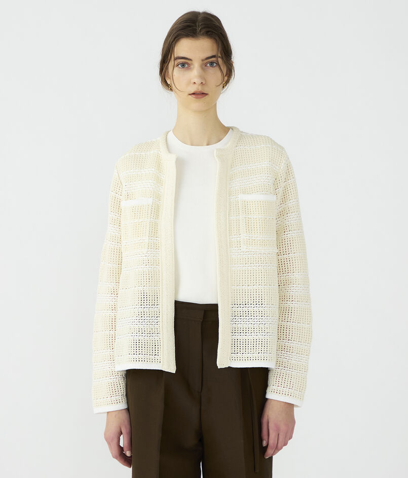 ボタンレスのデザインでさらりと羽織れ、きれいめからカジュアルまで幅広いスタイリングを楽しめるアイテムです。