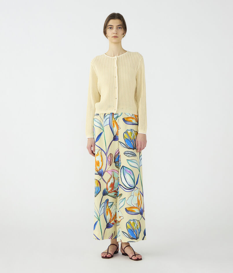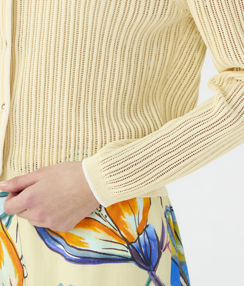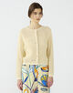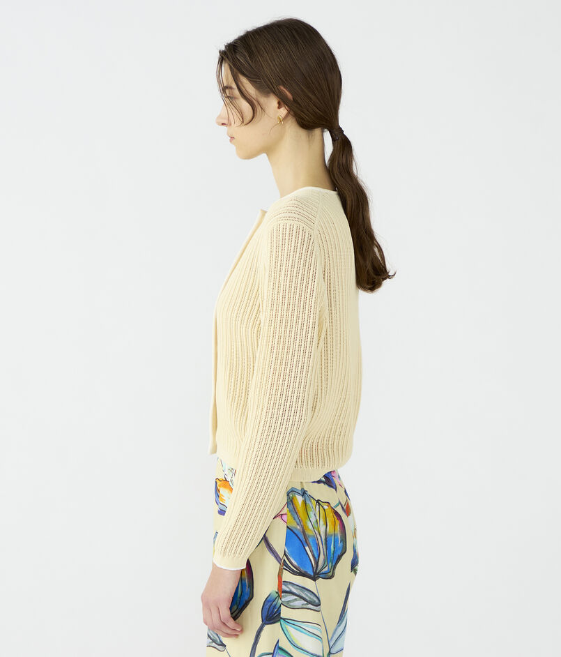 カーディガンはすっきりとしたショート丈でワンピースやボリュームのあるボトムスとも相性抜群の一枚。
